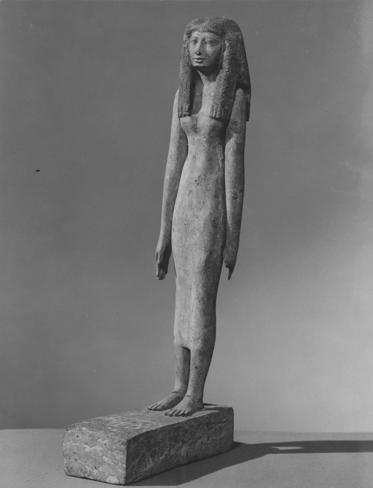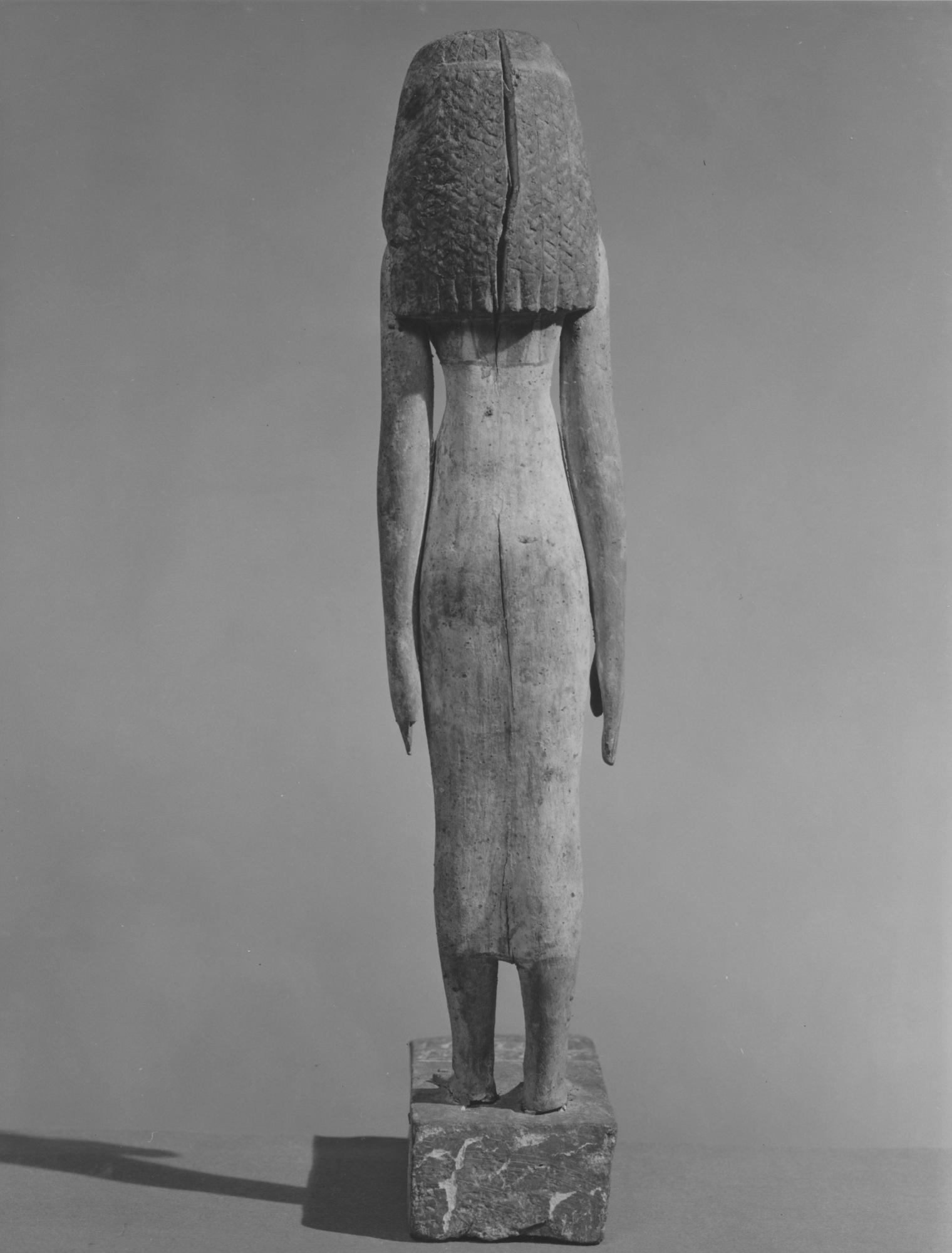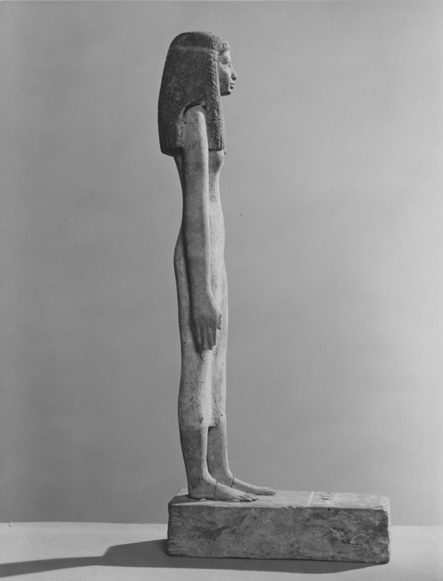 Sculptors carved tomb statues intended to provide youthful, idealized depictions of their subjects throughout time. The garments shown on sculptures were more likely to convey the Egyptians’ sense of perfection than to reflect actual fashions. This figure’s garment, far too tight to allow movement, emphasizes every curve of the slender, graceful female body.