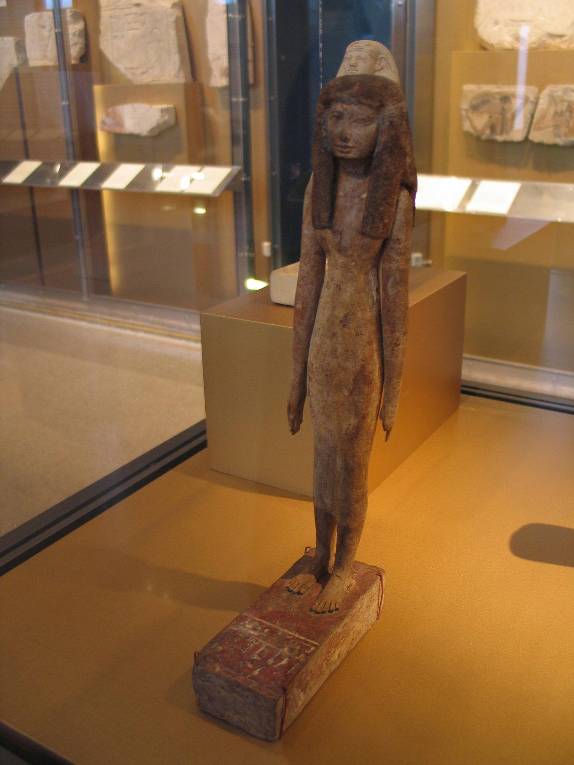 Only one of them is a shabty for Sati. The colorful one with inscriptions. The wooden statues served a different purpose, but were likely entombed with a deceased as part of their funerary equipment.Oh I see.Why is this woman's hair so big?