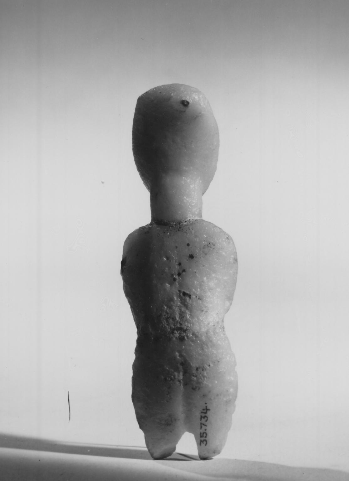 Keros-Syros; Pre-Hellenic; Greek; Cycladic. Folded-Arm Female Figurine, ca. 3100–3000 B.C.E.. Marble, 4 1/8 x 1 5/16 in. (10.4 x 3.3 cm). Brooklyn Museum, Charles Edwin Wilbour Fund, 35.734. (Photo: Brooklyn Museum)
