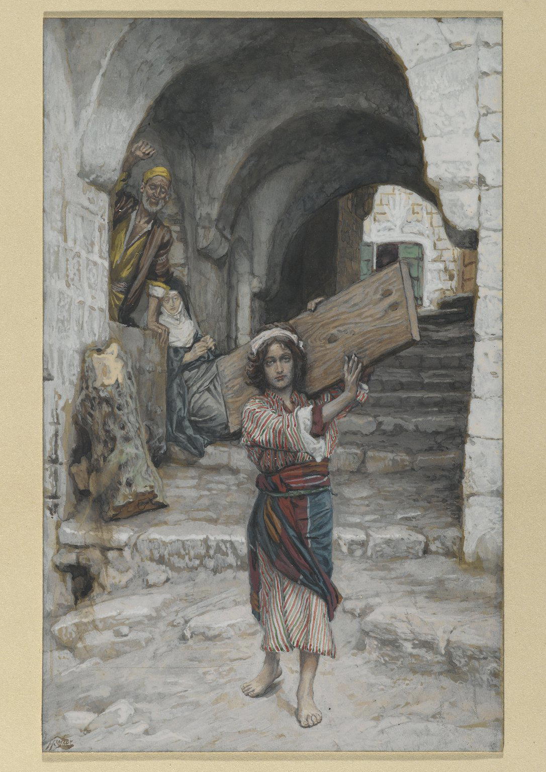 Anticipating the Passion, in which he will carry the cross, the young Jesus shoulders a board for use in the shop, while his parents look on with foreboding.