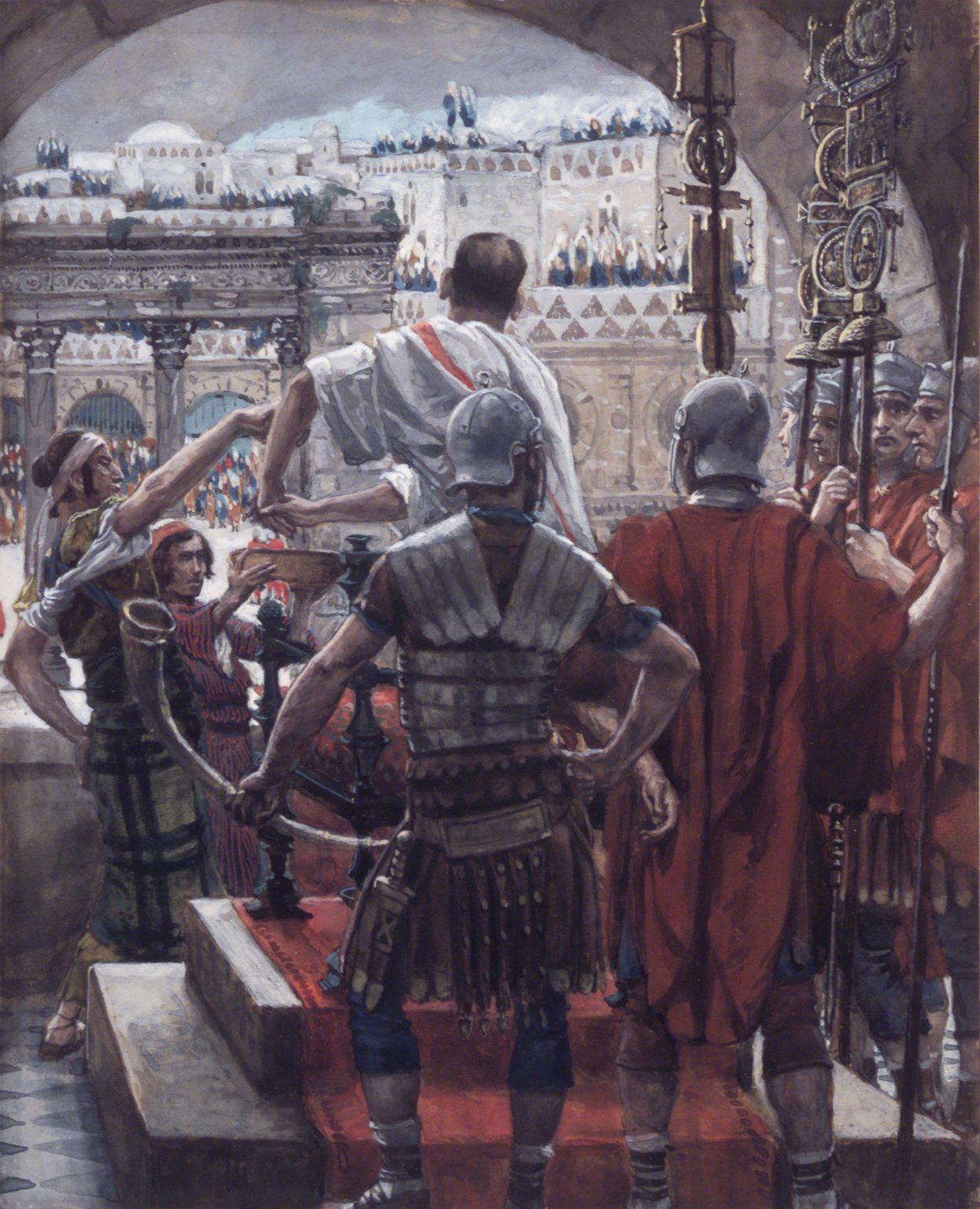 On the loggia before the assembled crowd, Pilate—convinced of Jesus’ innocence and impressed by his dignity, according to Tissot’s account—publicly washes his hands on the loggia before the square, symbolically distancing himself from the execution to follow.