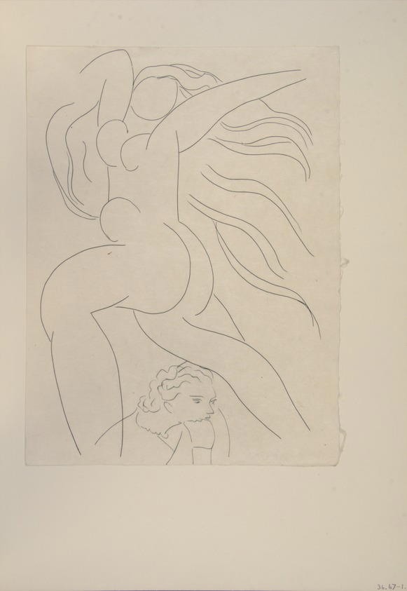 Henri Matisse (Le Cateau–Cambrésis, France, 1869 – 1954, Nice, France). [Untitled] (llustration for the Poem "Le Guignon"), 1932. Etching on colored wove paper, Sheet: 13 x 9 13/16 in. (33 x 24.9 cm). Brooklyn Museum, Carll H. de Silver Fund, 36.67.1. (Photo: Brooklyn Museum)