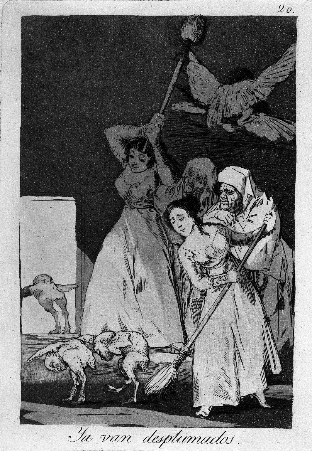 Francisco de Goya y Lucientes (Spanish, 1746–1828). There They Go Plucked (Ya van desplumados), 1797–1798. Etching, aquatint, and drypoint on laid paper, Sheet: 11 7/8 x 5 3/16 in. (30.2 x 13.2 cm) Image: 7 3/4 x 5 3/16 in. (19.7 x 13.2 cm). Brooklyn Museum, A. Augustus Healy Fund, Frank L. Babbott Fund, and Carll H. de Silver Fund, 37.33.20. (Photo: Brooklyn Museum)
