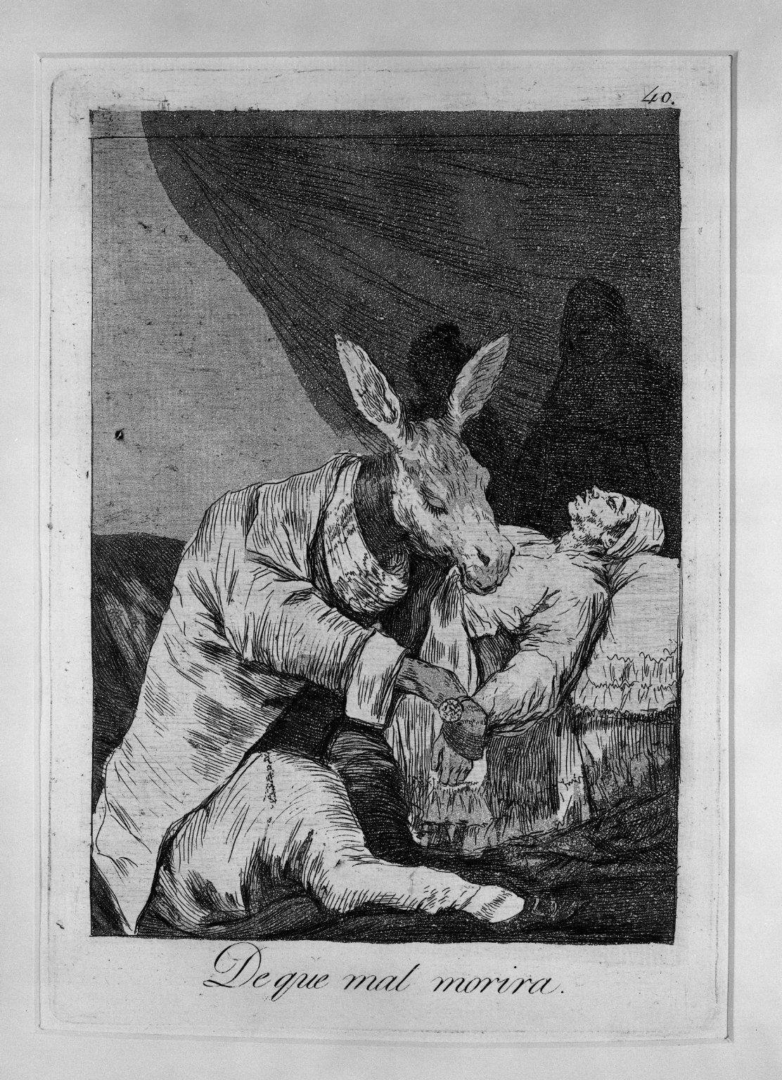 Francisco de Goya y Lucientes (Spanish, 1746–1828). Of What Will He Die? (De que mal morira?), 1797–1798. Etching and aquatint on laid paper, Sheet: 11 7/8 x 8 in. (30.2 x 20.3 cm) Other (Plate): 8 9/16 x 5 15/16 in. (21.7 x 15.1 cm) Image: 7 3/8 x 5 3/16 in. (18.7 x 13.2 cm). Brooklyn Museum, A. Augustus Healy Fund, Frank L. Babbott Fund, and Carll H. de Silver Fund, 37.33.40. (Photo: Brooklyn Museum)