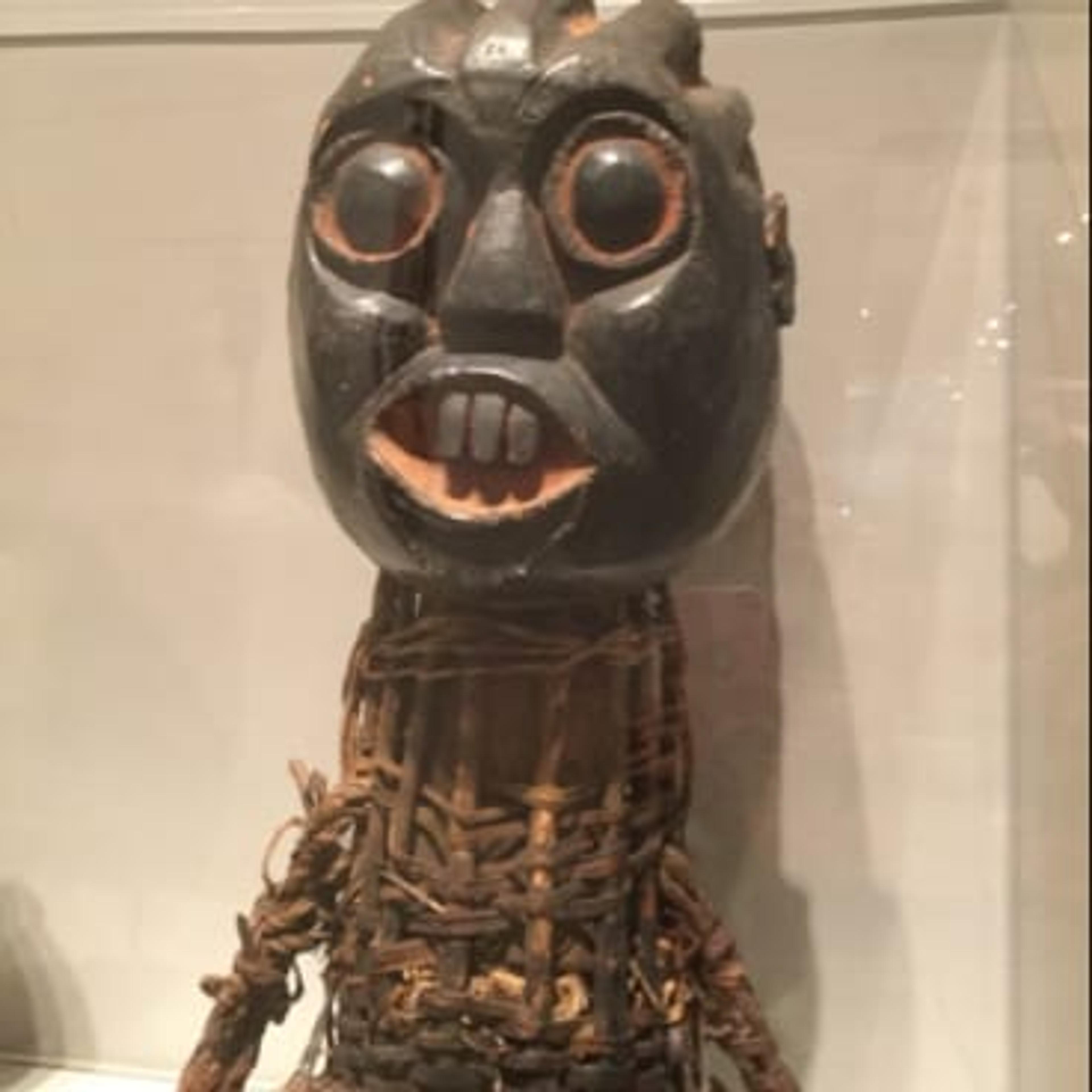 Masks like this would have been worn during funerals. It would sit on top of a person's head, so it would command a lot of respect from the spectators. A skirt would cover the woven basket like neck. The straps you see would help keep the mask on the wearer's head.It comes from the Baumam kingdom of Cameroon and would have been worn by a member of a secret men's society known as Nsoro.Cool but I think it is scary a little. I don't want to be afraid AND sad at a funeral.I can see that for sure.The Nsoro society I mentioned earlier were warriors tasked with maintaining social order. It makes sense that a mask representing them would be a bit fearsome don't you think?The carving at the top of the head represents the elaborate woven hats popular among high ranking men in Bamum society.Yes but why are there three teeth instead of two like rabbit teeth?It was a choice by the artist who made the mask. However, I'm not comfortable speculating any meaning from the way the teeth are carved. Masks are often nonrepresentational/otherworldly characters blended with human characteristics.Sometimes the choices can tell us a bit about what's happening when a mask is made. For example, the Ode-Lay Mask in the same room has dragons on it because kung-fu movies were really popular in Sierra Leone at the time.What was this mask used for?