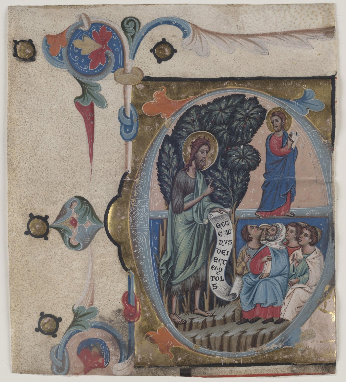 Unknown Artist. Illuminated Letter E, early 14th century (possibly). Painting on parchment in red, blue, green, brown, light blue, light green, and pink, India ink, and gold leaf, sheet: 6 15/16 x 6 in. (17.6 x 15.2 cm). Brooklyn Museum, Museum Collection Fund, 38.742. (Photo: Brooklyn Museum)