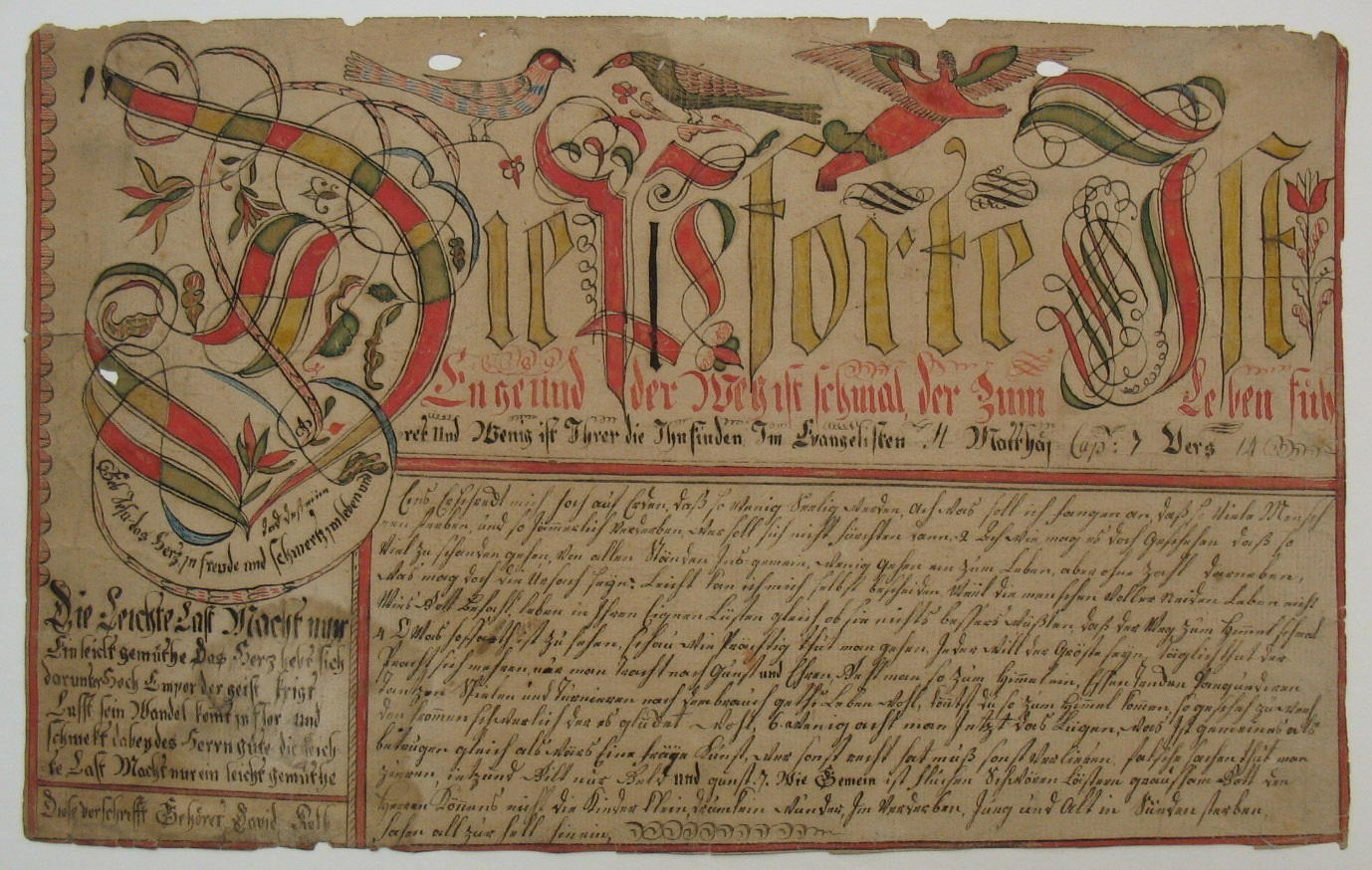 Unknown Artist. Fractur Drawing, ca. late 18th–early 19th century. Pen, ink and watercolor on paper, Sheet: 8 1/4 x 13 1/4 in. (21 x 33.7 cm). Brooklyn Museum, Dick S. Ramsay Fund, 39.548. (Photo: Brooklyn Museum)