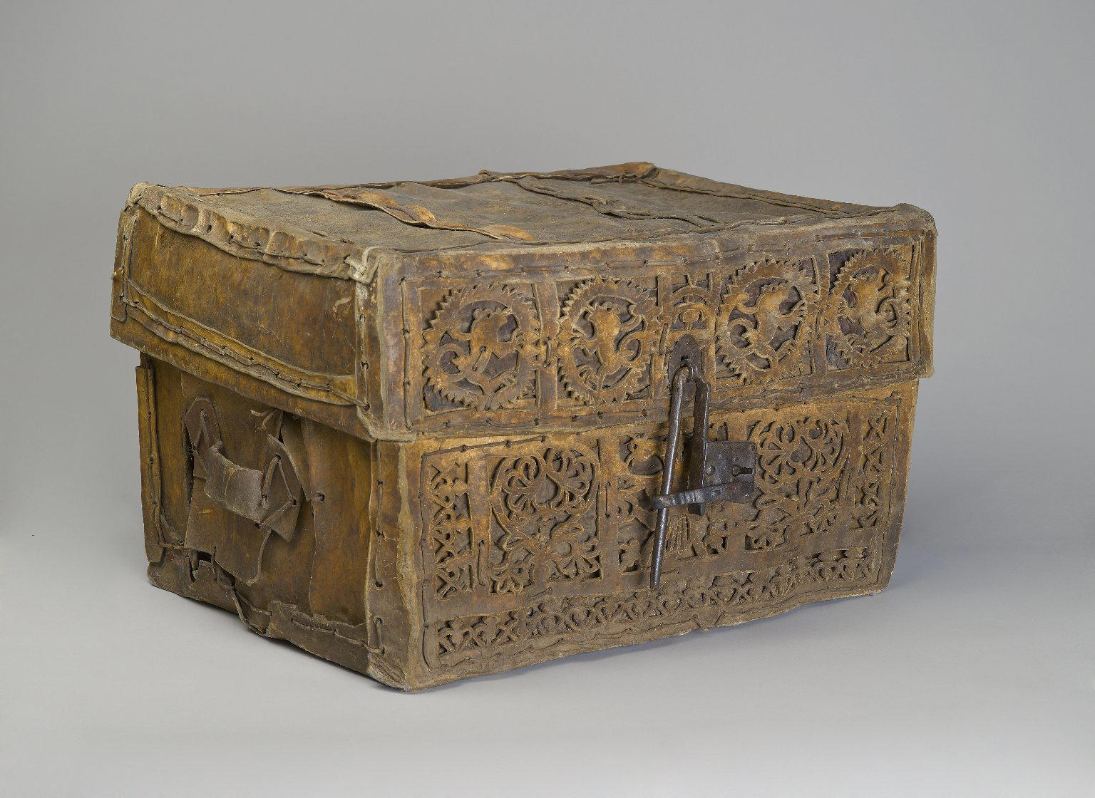 Unknown Artist. Trunk (Petaca), 18th century. Cowhide, leather, and wood, 16 3/4 x 29 3/4 x 21 1/4 in. (42.5 x 75.6 x 54 cm). Brooklyn Museum, Museum Expedition 1941, Frank L. Babbott Fund, 41.1275.171. (Photo: Brooklyn Museum)