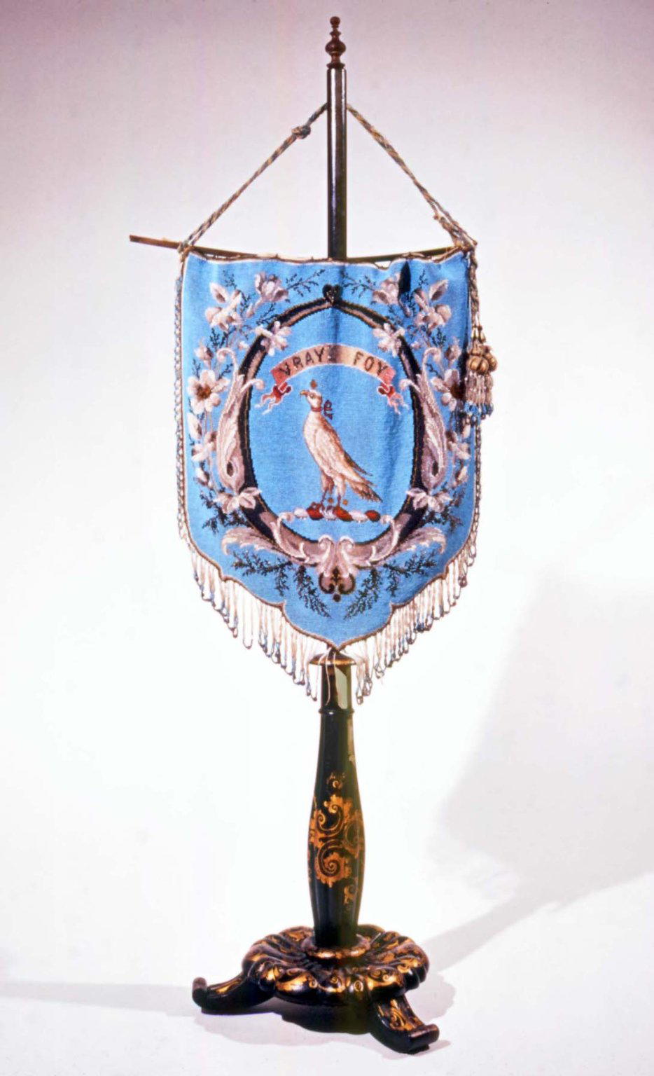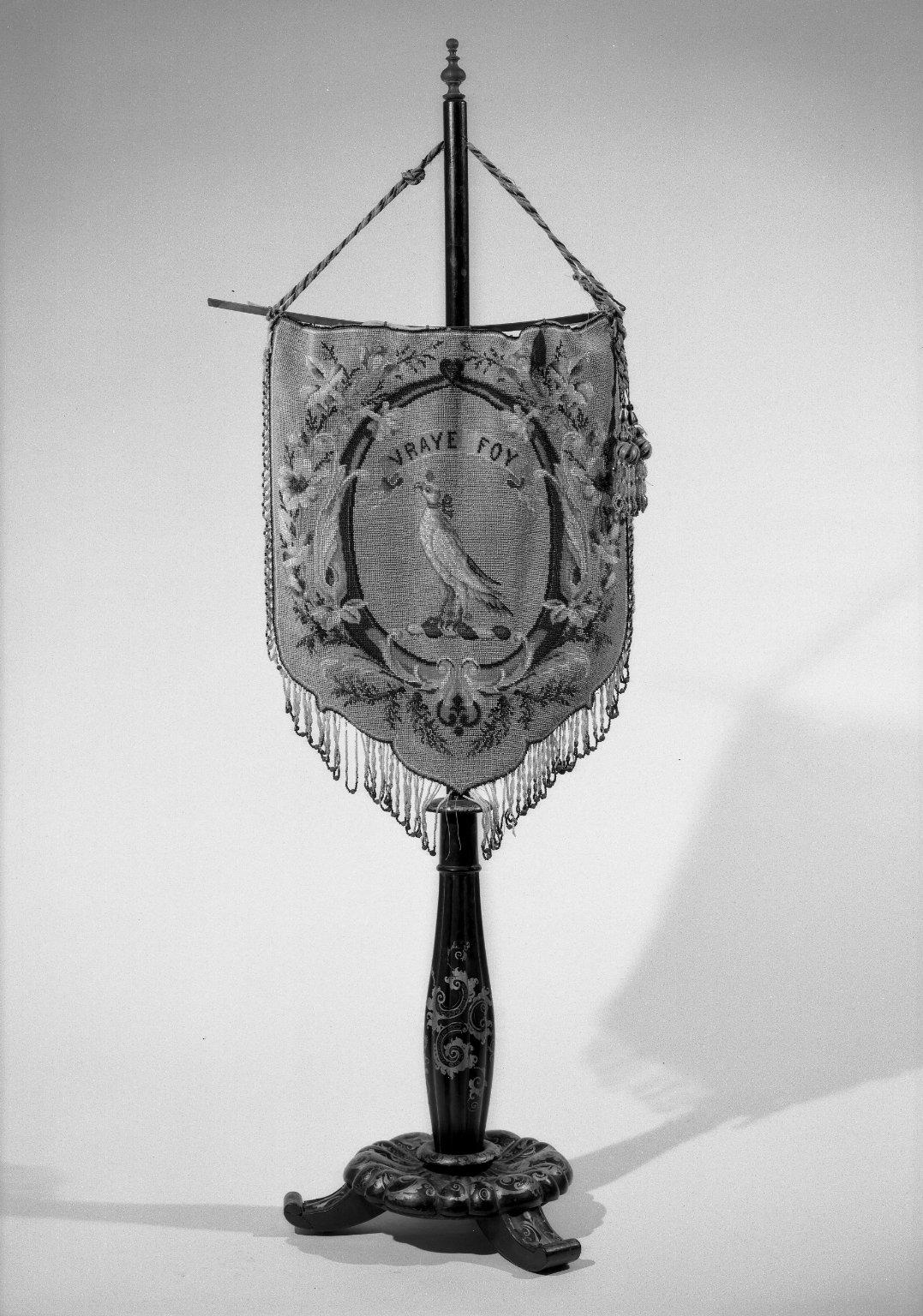 Fire Screen, ca. 1850. Ebonized wood, bead-work, brass, a. Fire Screen: 24 × 19 1/4 in. (61 × 48.9 cm) b. Stand: 54 1/2 × 18 1/4 × 14 in. (138.4 × 46.4 × 35.6 cm) frag1-42.5a - metal piece: 1/2 × 19 1/4 × 1/8 in. (1.3 × 48.9 × 0.3 cm) frag2-42.5a: tasseled cord: 1 5/8 × 67 in. (4.1 × 170.2 cm). Brooklyn Museum, Gift of Mrs. Frank L. Babbott, 42.5a-b. (Photo: Brooklyn Museum)