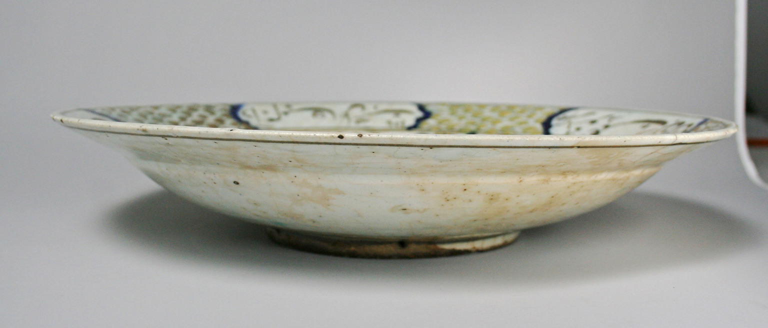 Dish Depicting Turbaned Youth and Persian Poetic Inscriptions, early 17th century. Ceramic, slip, underglaze, glaze, 13 5/8 x 2 9/16 in. (34.6 x 6.5 cm) Thickness of rim: 1/8 in. (0.3 cm). Brooklyn Museum, Gift of Mrs. Horace O. Havemeyer, 42.212.31. (Photo: Brooklyn Museum)