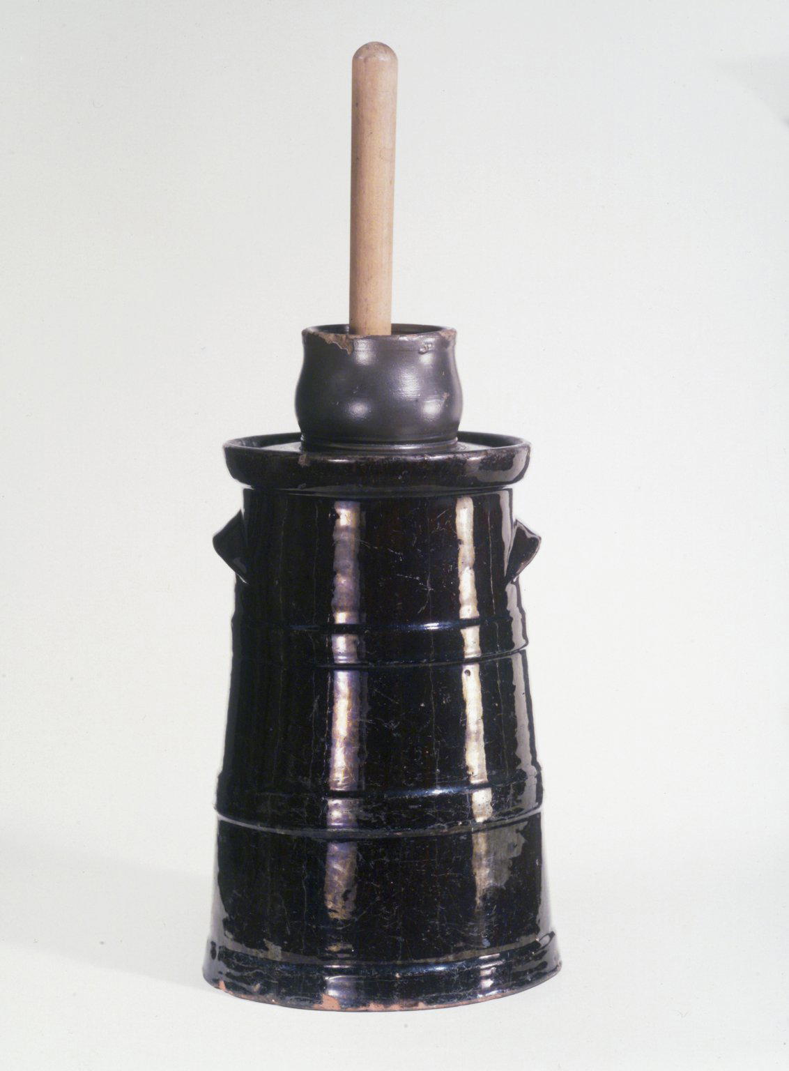 American. Churn with Cover and Dasher, mid–19th century. Earthenware and wood, 13 3/4 in. (34.9 cm) base: 7 5/8 in. (19.4 cm) Wooden dasher: 19 × 4 1/2 in. (48.3 × 11.4 cm). Brooklyn Museum, Gift of Arthur W. Clement, 43.128.83. (Photo: Brooklyn Museum)
