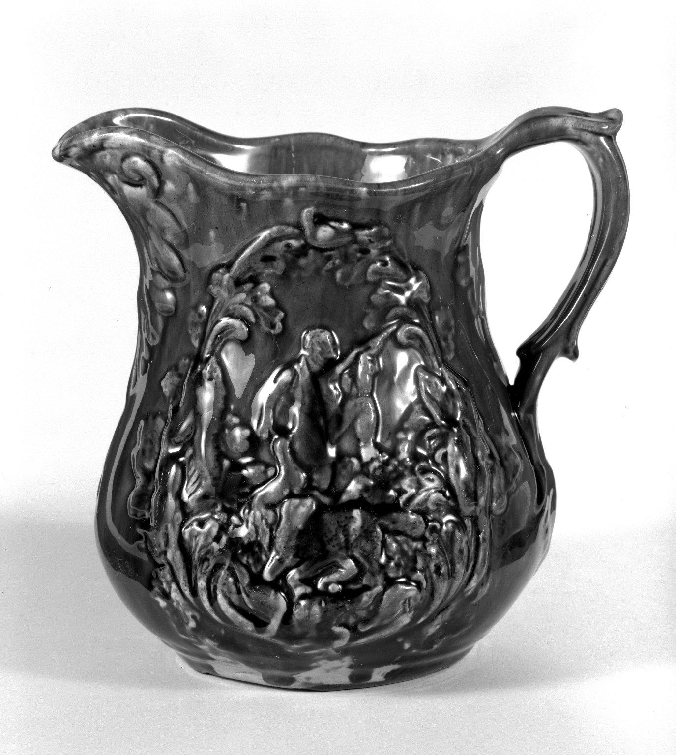 Charles Coxon (American, born in England, 1805–1868); E & W Bennett. Pitcher (Daniel Boone Design), 1850–1856. Earthenware, 7 5/16 in. (18.5 cm) Diameter of base: 3 3/4 in. (9.5 cm). Brooklyn Museum, Gift of Arthur W. Clement, 43.128.129. (Photo: Brooklyn Museum)
