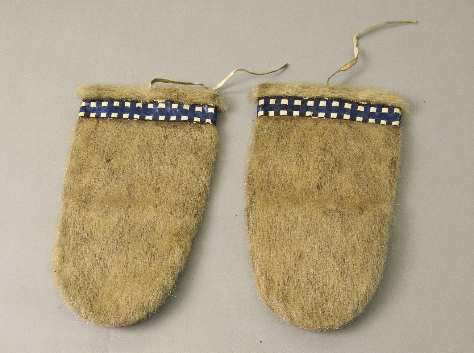 Kalaallit (Greenlander Inuit). Pair of Mittens with blue and white checked leather trim, early 20th century. Fur, hide, dye, 11 x 6 1/4 in. or (28.0 x 15.5 cm) each. Brooklyn Museum, Gift of Sidney Weiner and Harry Hurdy, 47.172.6a-b. (Photo: Brooklyn Museum)