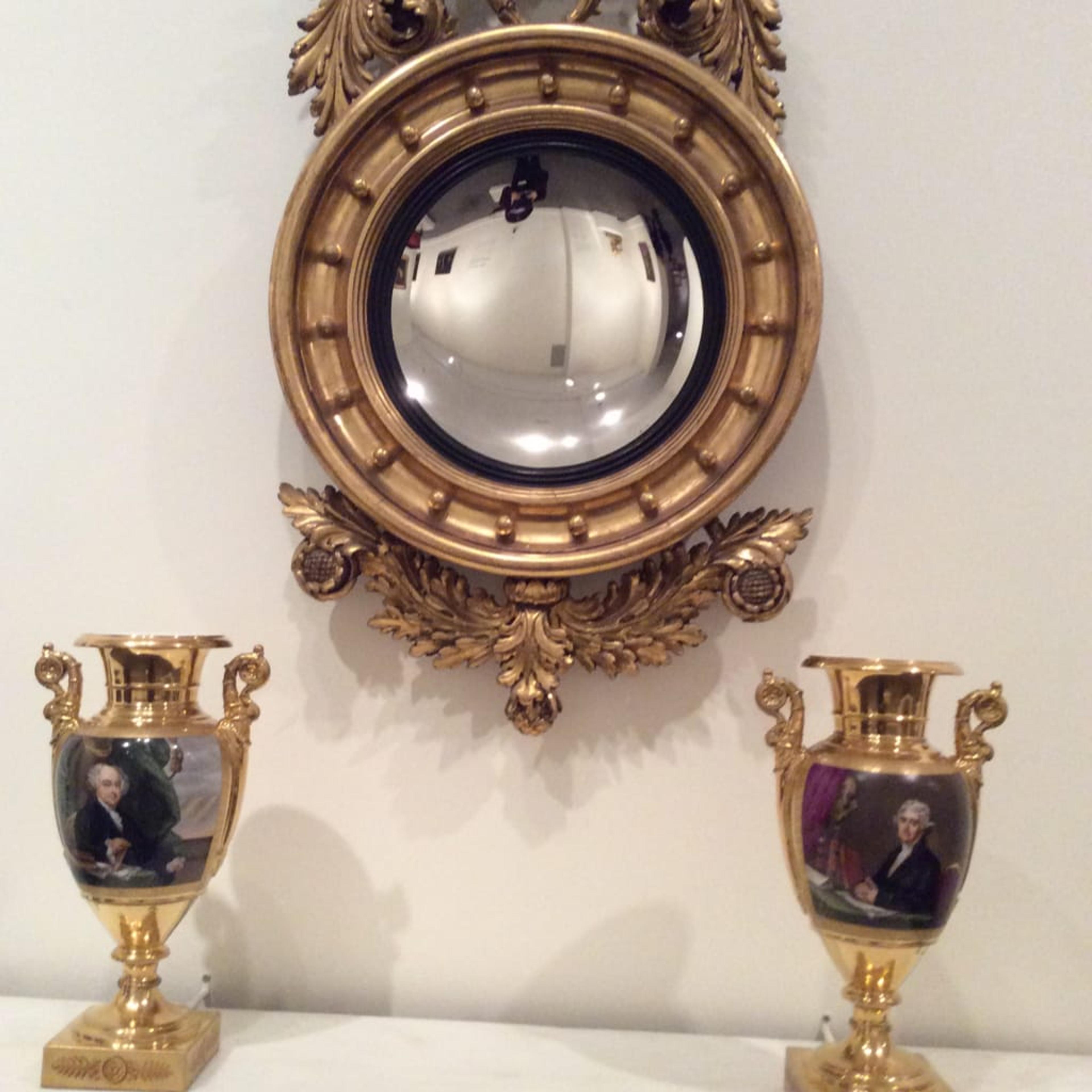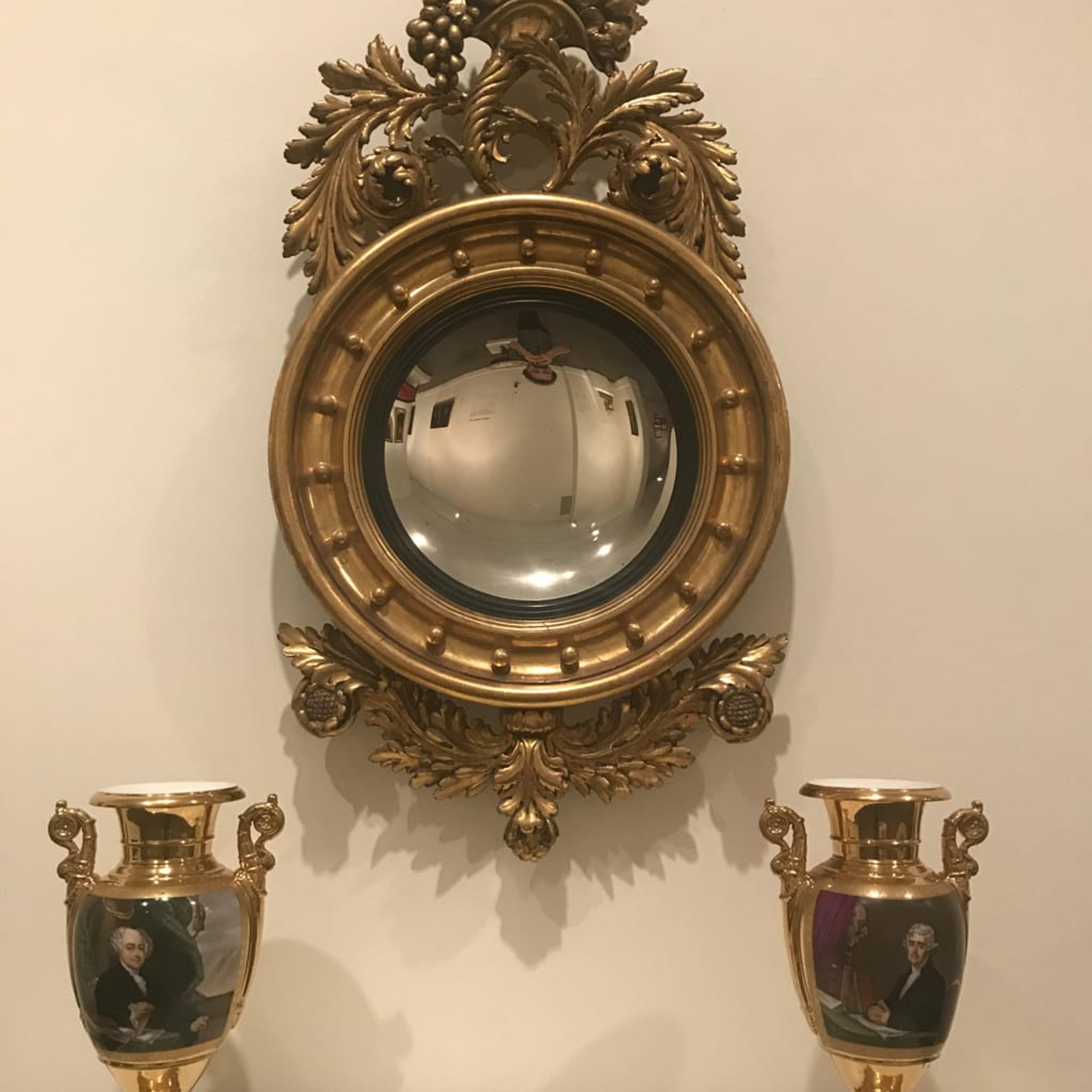 The mirror, from 1830, might appear unusual to you. The curved surface would better reflect candlelight in early 19th century homes. This additional light would, in turn, help the owner show off the kind of fashionable Neoclassical style furnishings that you see below the mirror.