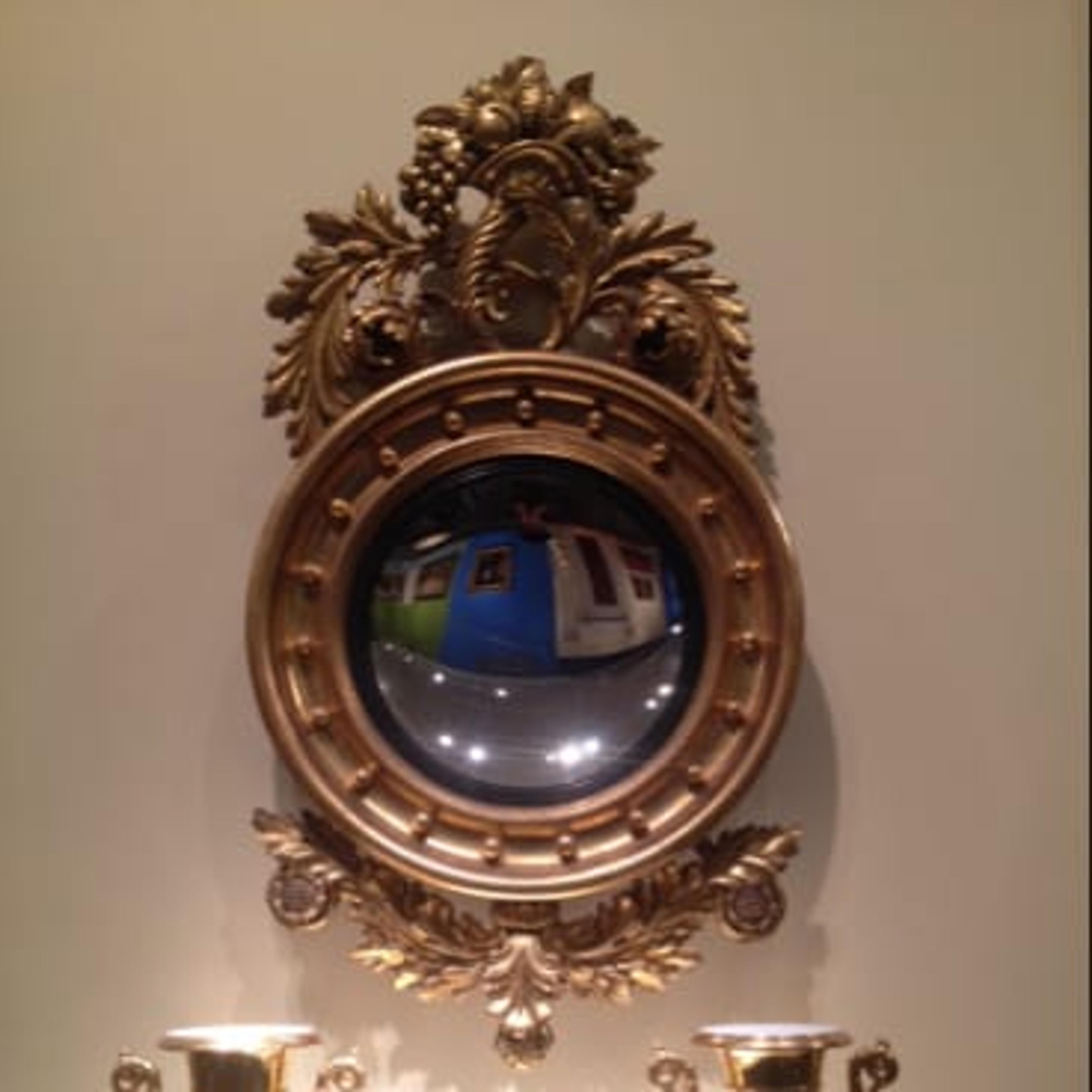 That particular mirror is made of gilt wood meaning that someone would have carved that elaborate frame in which the mirror would be placed. The technique was likely similar to that used to carve actual frames for works of art. The mirror itself is made of curved, silvered glass, giving the convex shape. This came in handy in homes before electricity because a convex mirror would reflect candle light well throughout a room.Oh wow, that's so interesting! Thanks!You're very welcome! Feel free to send along more questions as you continue to explore the Museum today.I'm curious about the concave mirror in the Colonial gallery.
