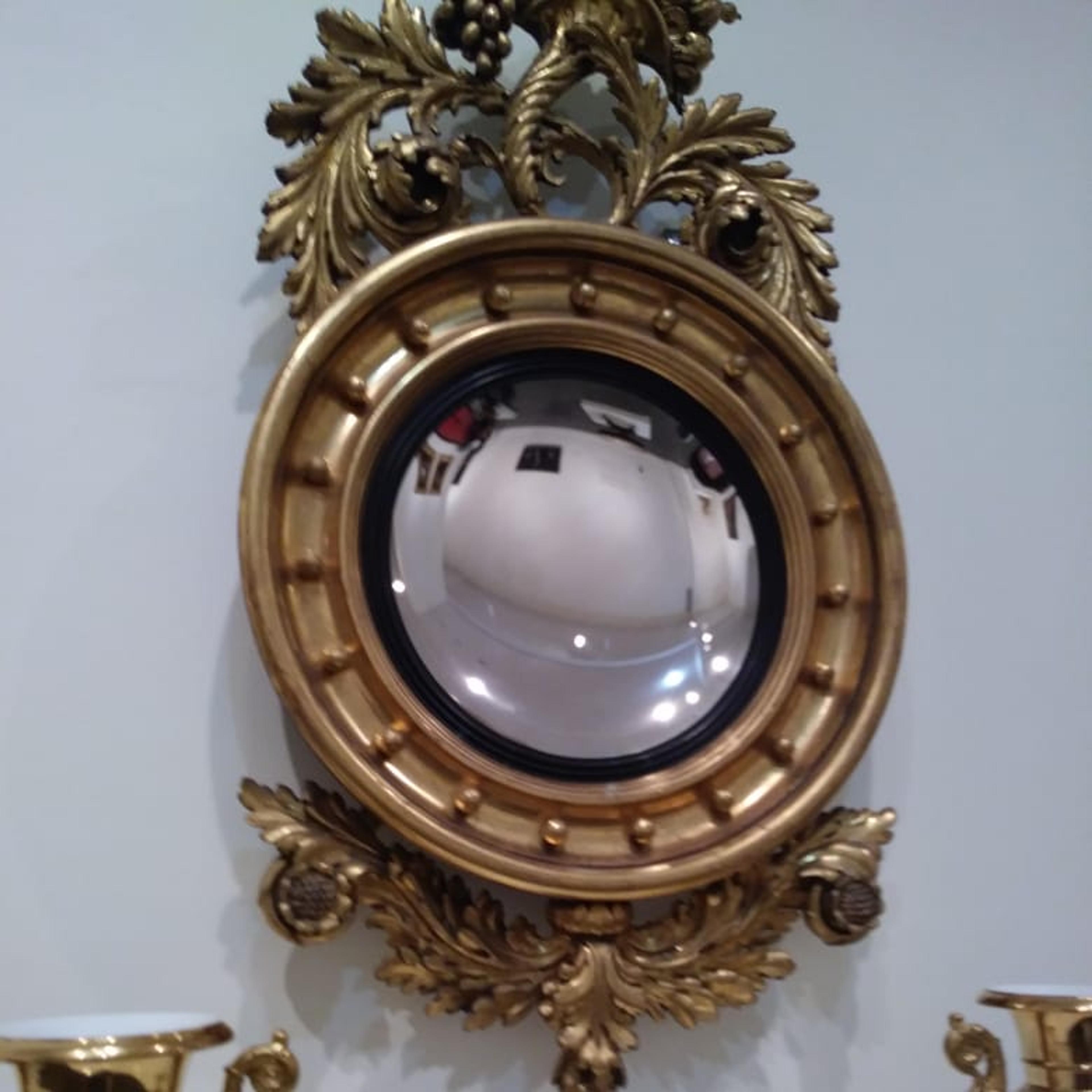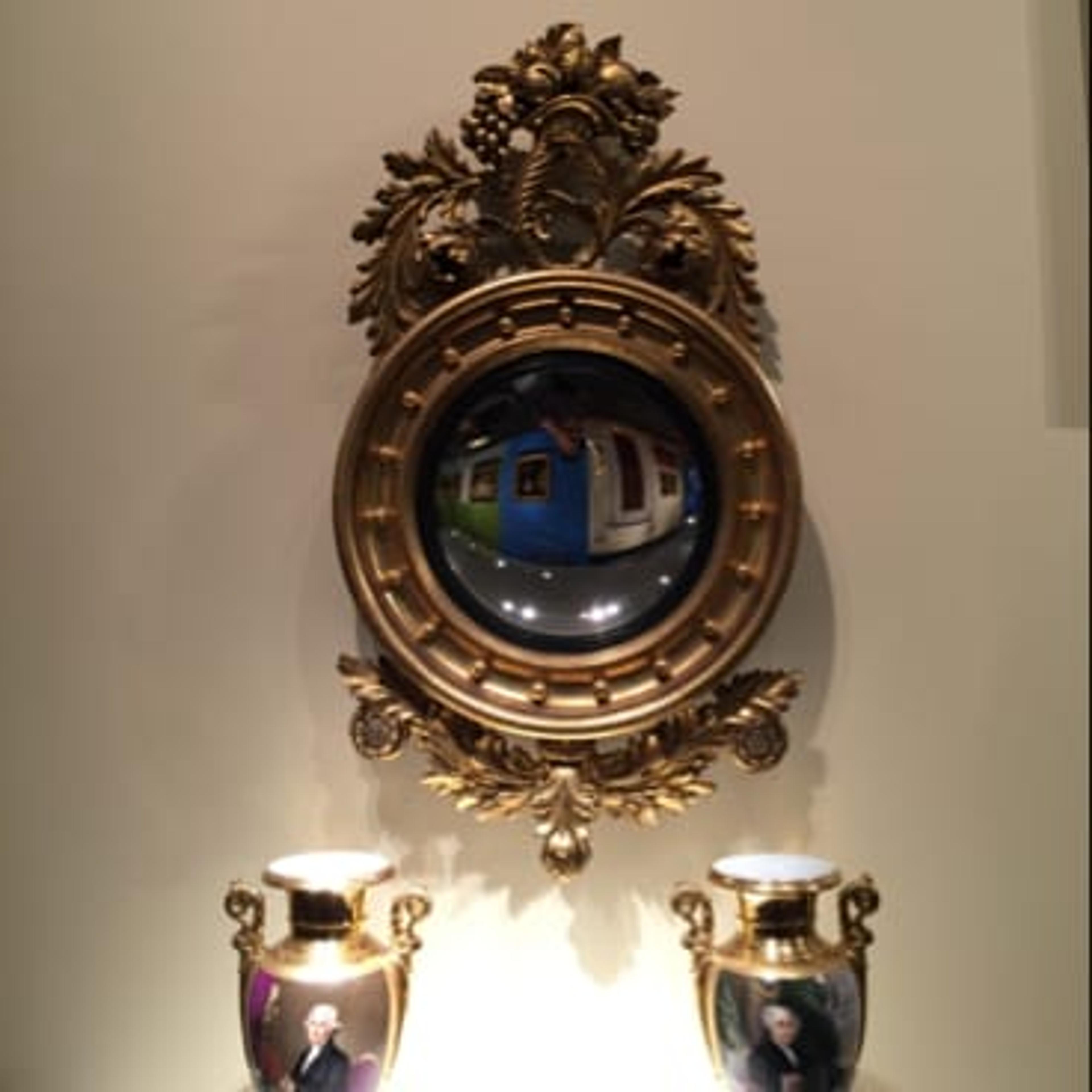 My pleasure! I love design from the first decades of the 19th century. This furniture group is in the late neoclassical style, sometimes referred to as the "Empire Style" because the fashion was being set by designers working in France during the Napoleonic Empire. The mirror is convex because it's function was to reflect light rather than to show one's appearance. It was common to place candles near mirrors, to double the light in a room.Wow! It's sounds like 19th century homes were pretty beautiful.Yes! They really loved gold in this period- you will notice that everything is gilded. The gilding would have caught the light and shone in dark rooms.What do we know about the manufacturing process for concave mirrors like this one? Does Anish Kapoor use the same process in his mirrors?