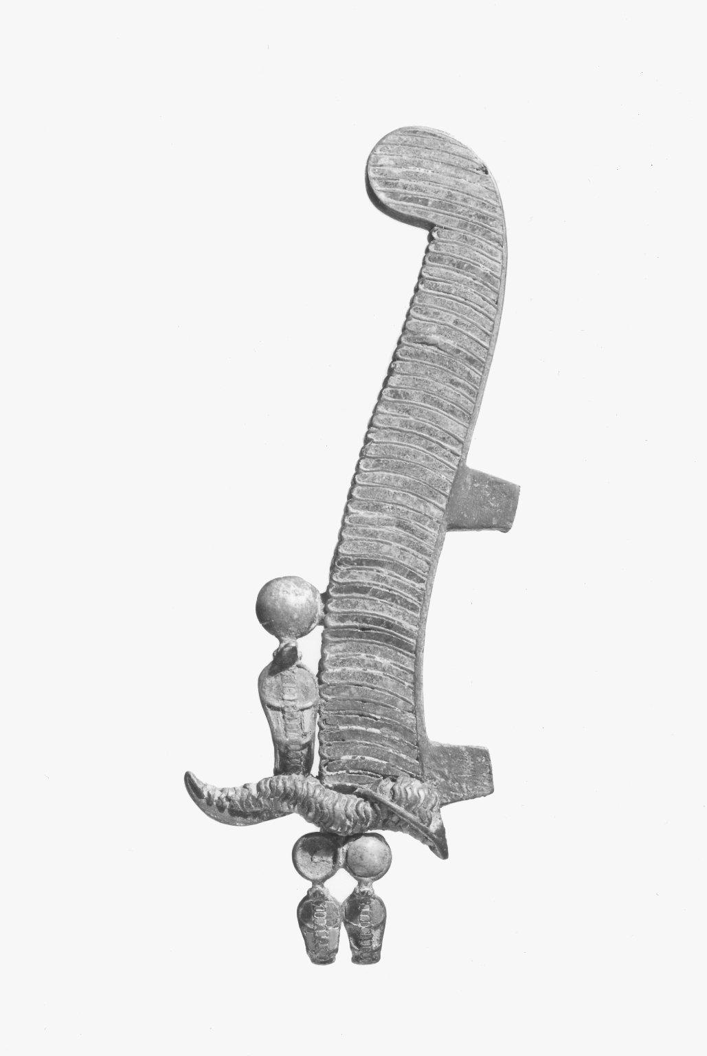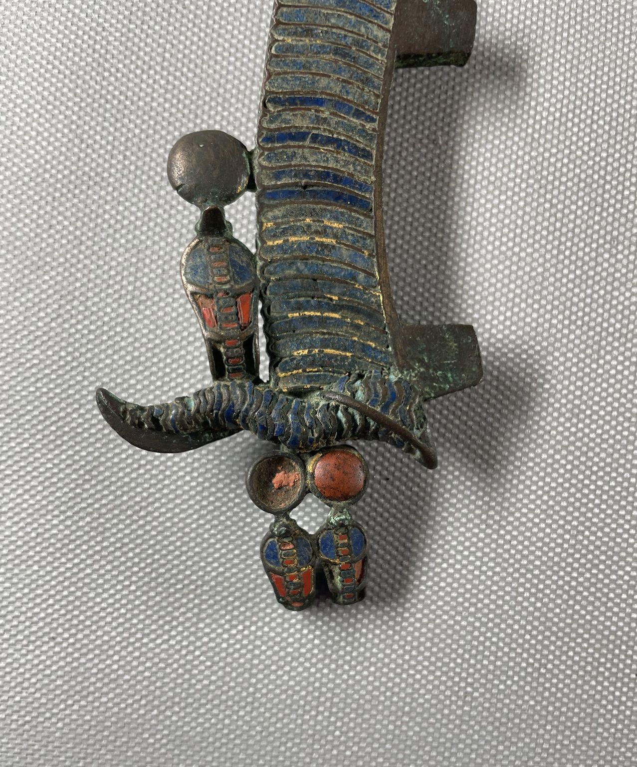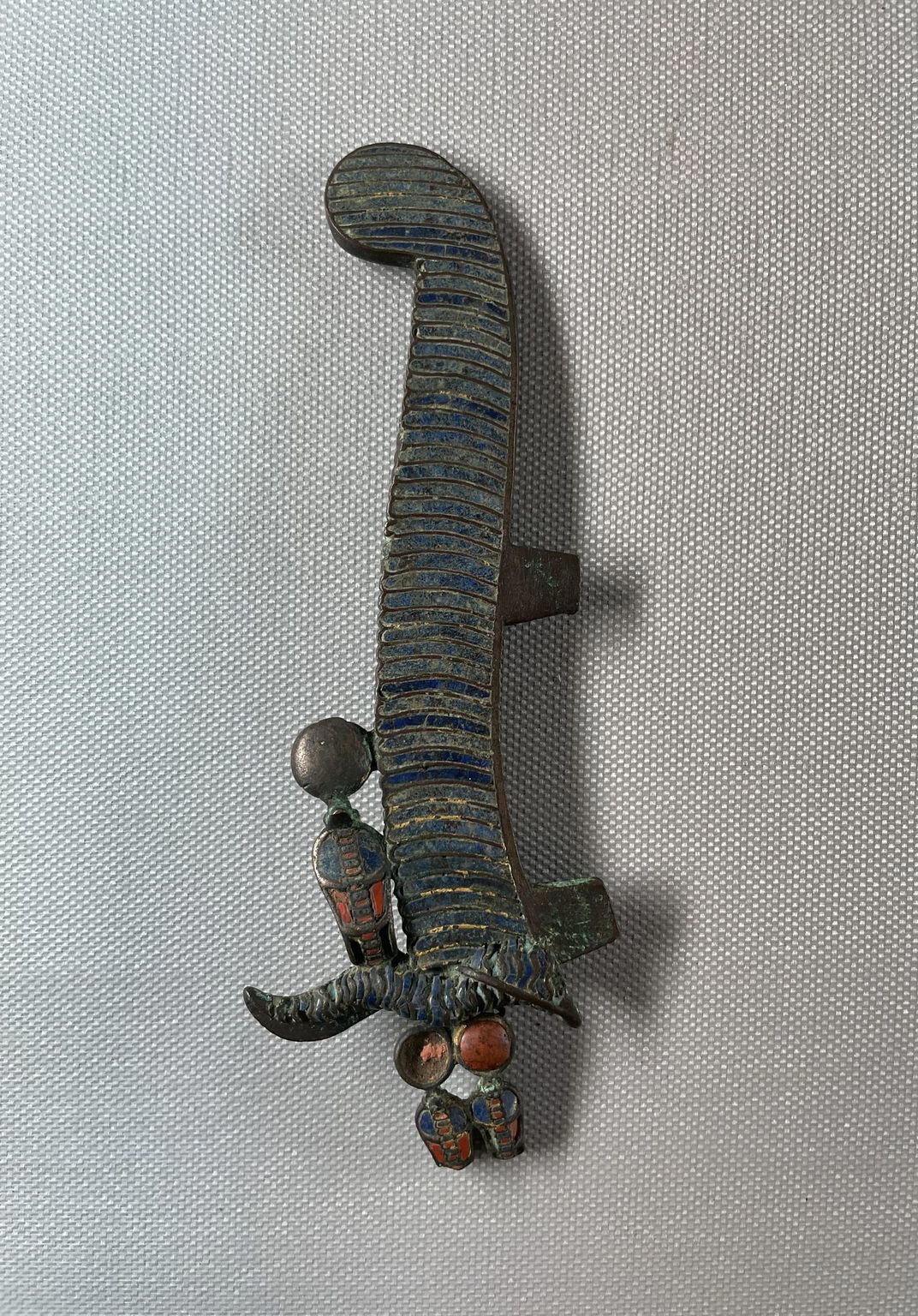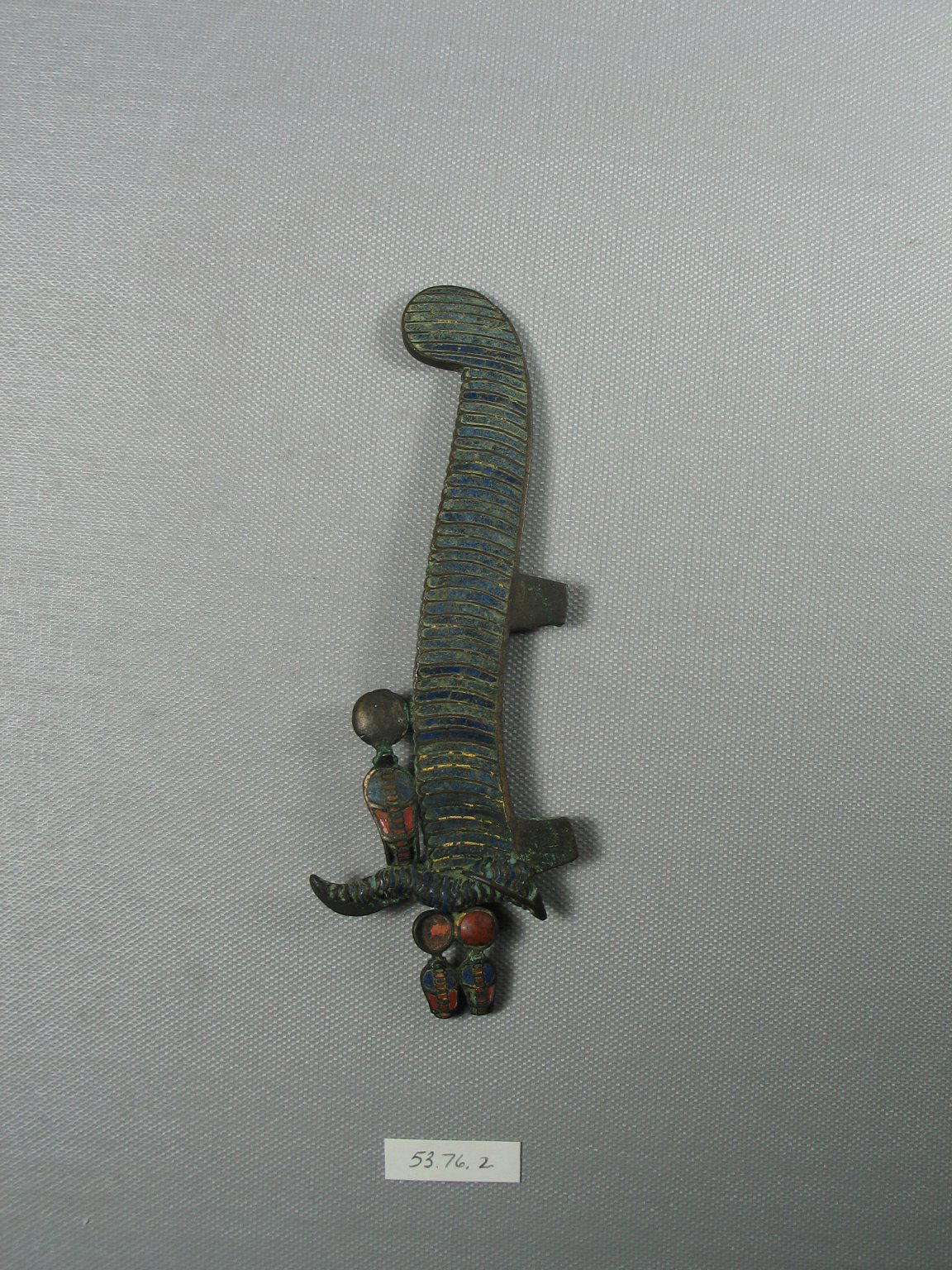 Inlaid Feather from an Atef Crown, 664–30 B.C.E.. Bronze, glass, gold, 6 3/16 × 2 3/16 × 1/2 in. (15.7 × 5.5 × 1.3 cm). Brooklyn Museum, Charles Edwin Wilbour Fund, 53.76.2. (Photo: Brooklyn Museum)