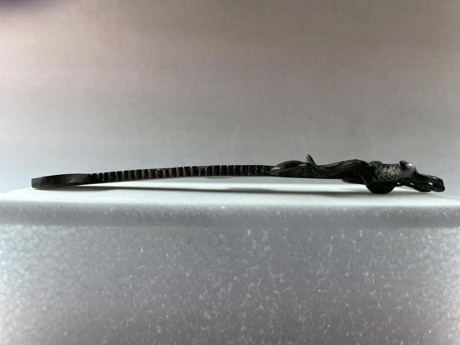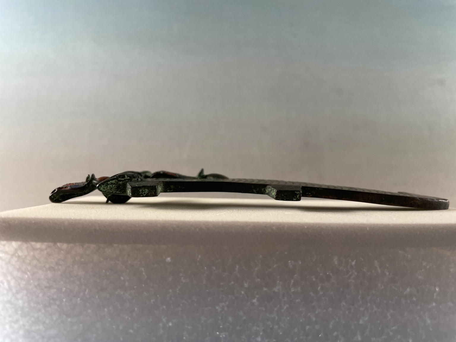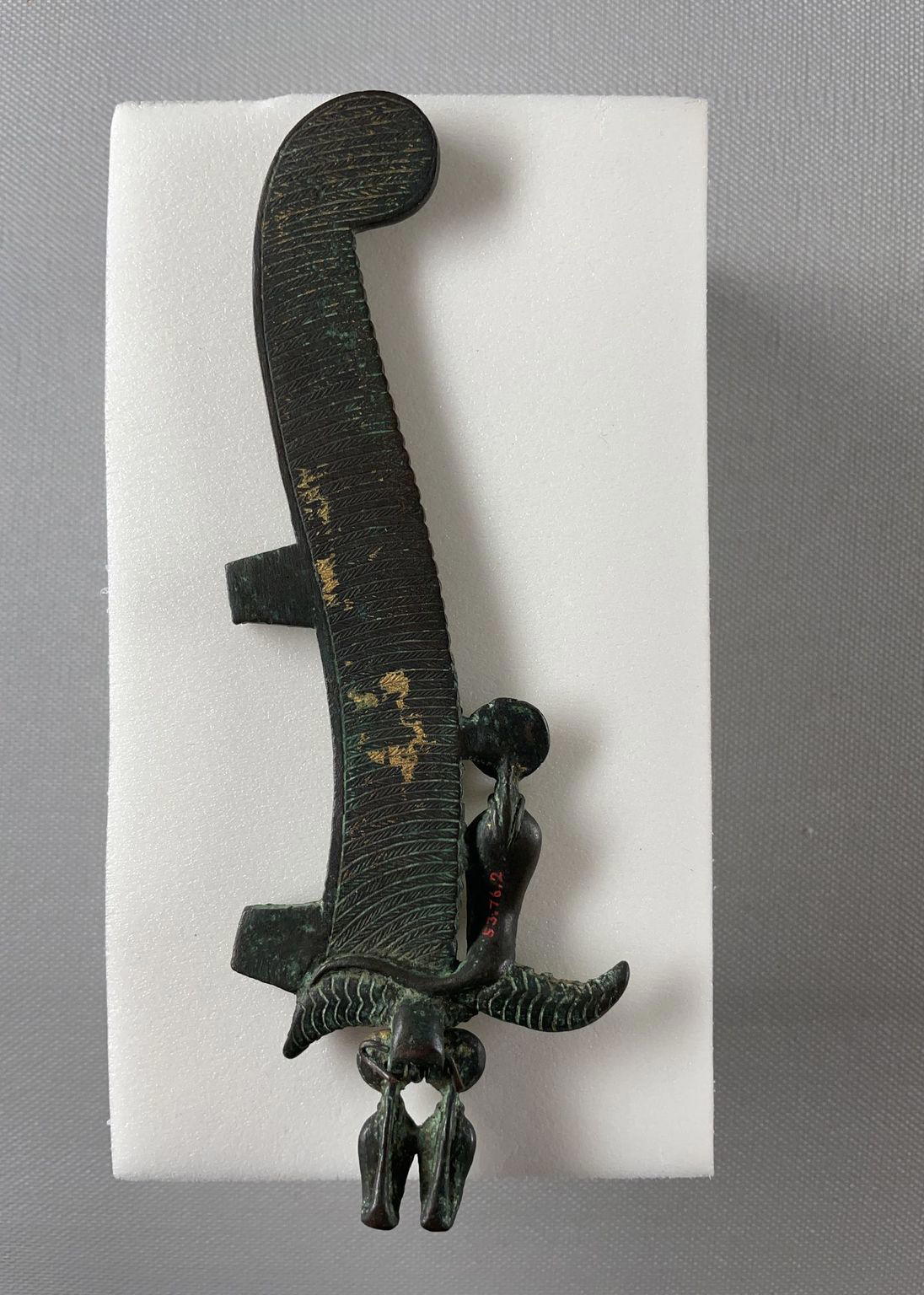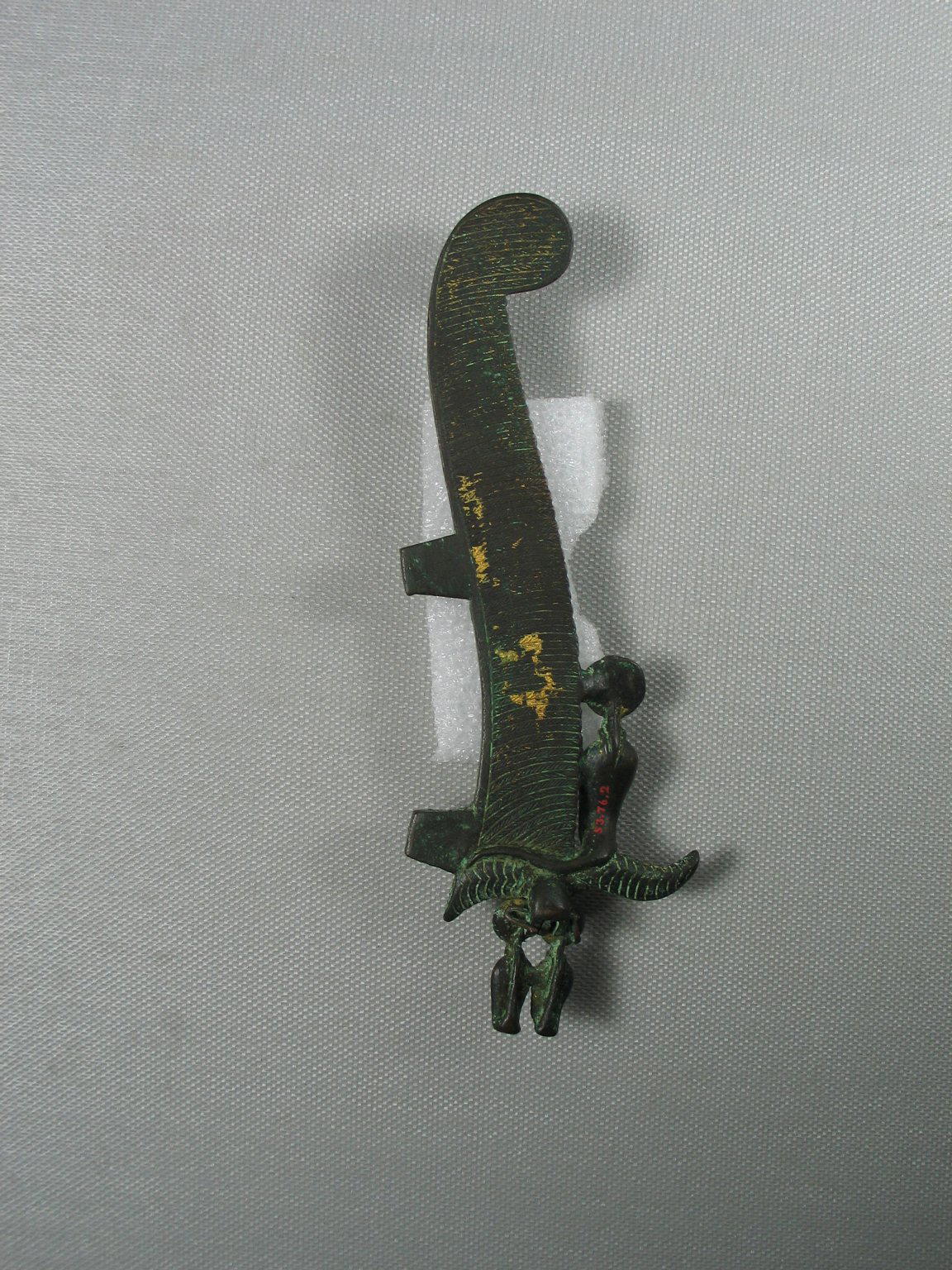 Inlaid Feather from an Atef Crown, 664–30 B.C.E.. Bronze, glass, gold, 6 3/16 × 2 3/16 × 1/2 in. (15.7 × 5.5 × 1.3 cm). Brooklyn Museum, Charles Edwin Wilbour Fund, 53.76.2. (Photo: Brooklyn Museum)