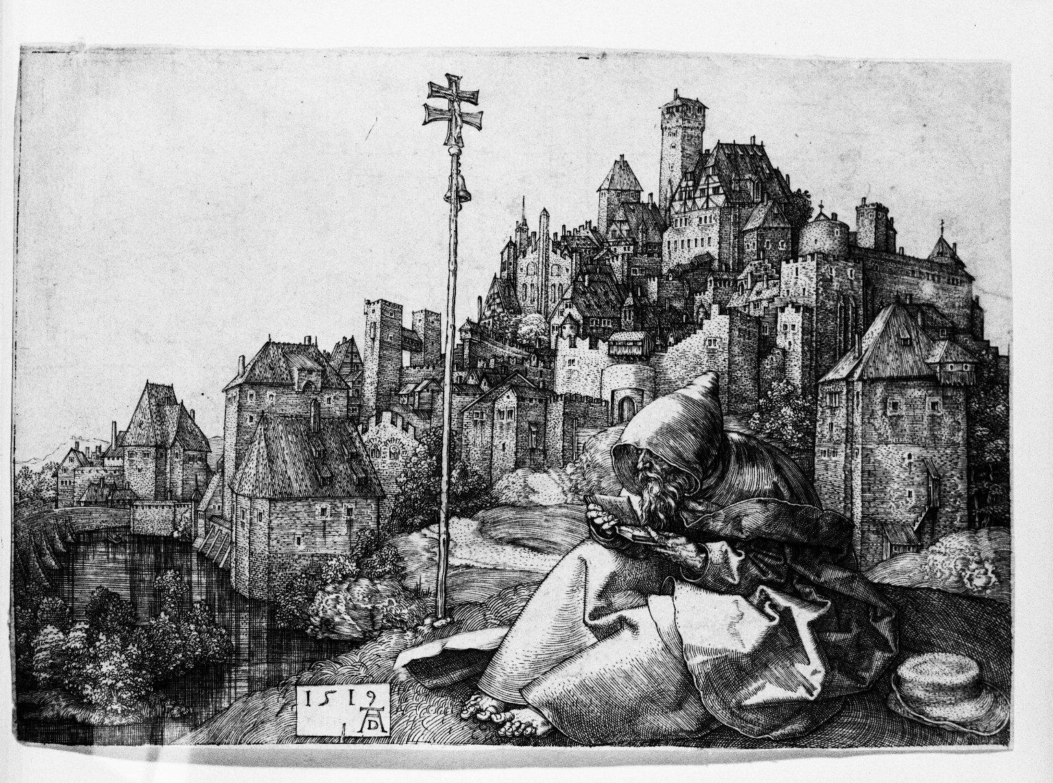 Albrecht Dürer (German, 1471–1528). Saint Anthony Reading, 1519. Engraving on laid paper, Sheet: 3 7/8 x 5 5/8 in. (9.8 x 14.3 cm). Brooklyn Museum, Gift of Mrs. Charles Pratt, 57.188.18. (Photo: Brooklyn Museum)