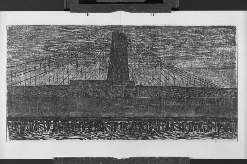 Antonio Frasconi (American, born Argentina, 1919–2013). The Storm - Brooklyn Bridge, 1952. Color woodcut on Japan paper, Image: 20 x 40 1/4 in. (50.8 x 102.2 cm). Brooklyn Museum, Dick S. Ramsay Fund, 58.11.1. (Photo: Brooklyn Museum)
