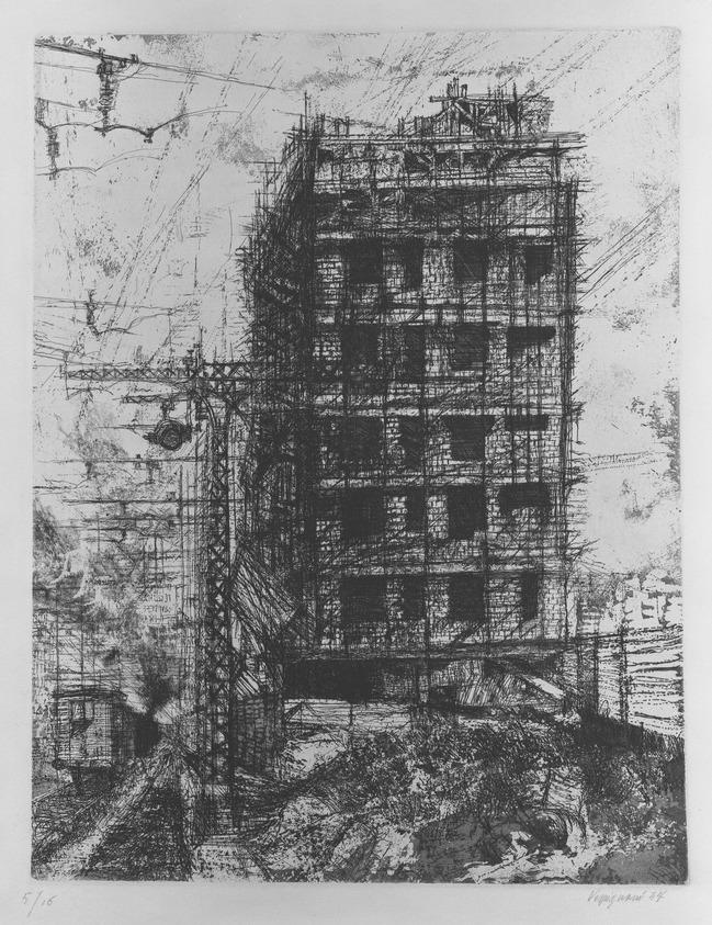 Renzo Vespignani (Italian, 1924–2001). Casa Sulla Ferrouia, 1957. Etching on wove paper, 15 13/16 x 12 3/16 in. (40.1 x 31 cm). Brooklyn Museum, Carll H. de Silver Fund, 58.165.19. (Photo: Brooklyn Museum)