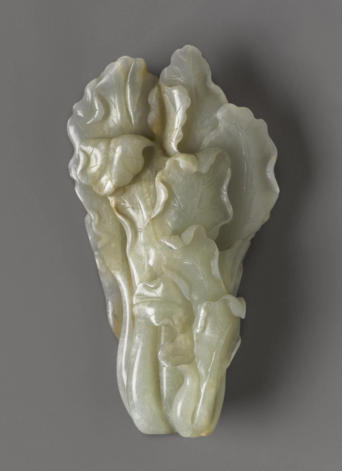 Carved white jade leaf cluster ornament, 19th century. Jade, brocade, 5 in. (12.7 cm). Brooklyn Museum, Gift of Mrs. Walter N. Rothschild, 63.6.36. (Photo: Brooklyn Museum)