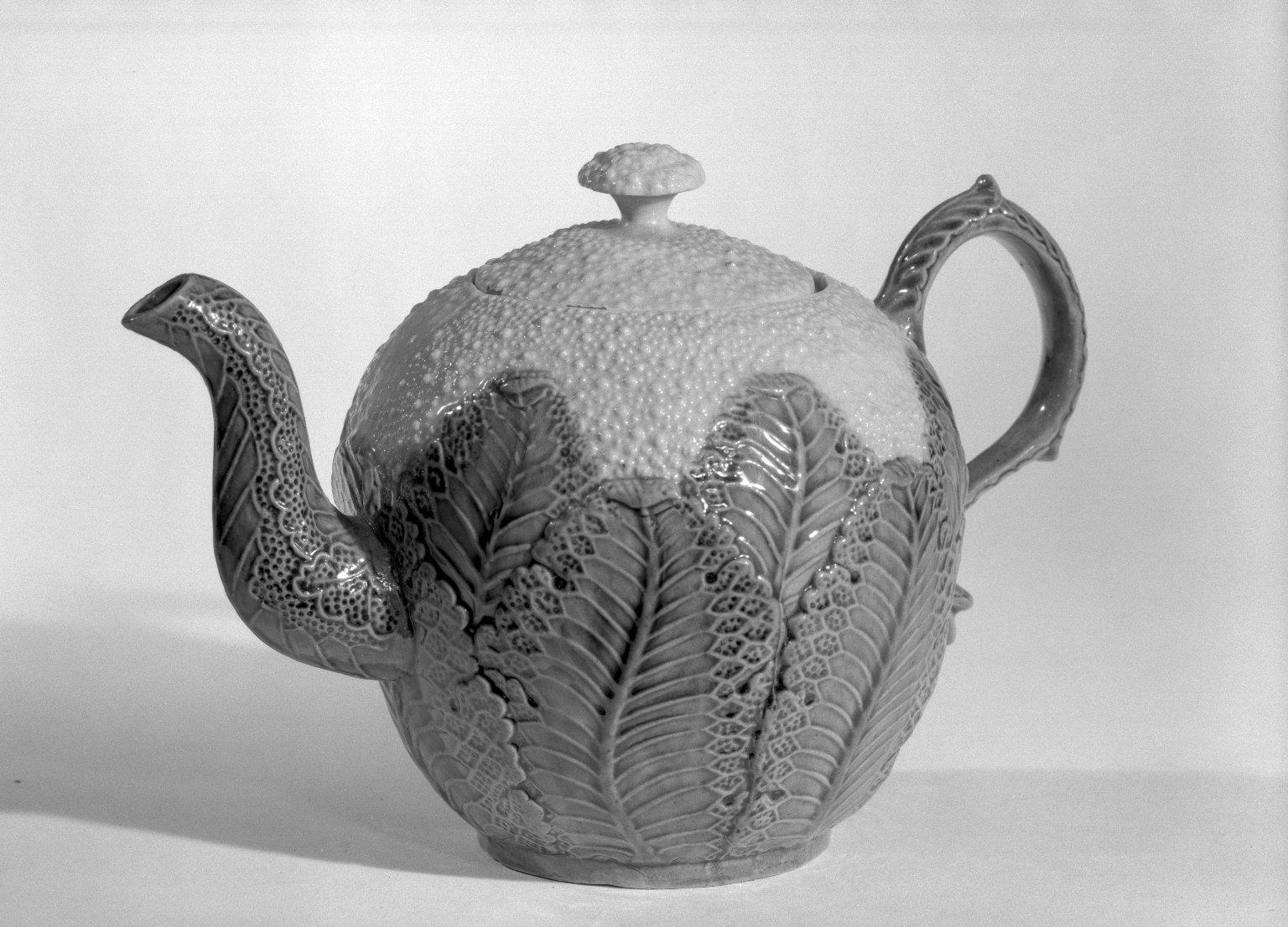 Wedgwood and Sons (British, Staffordshire, 1759–present). Cauliflower Shaped Teapot, ca. 1760. 5 3/4 x 8 1/2 x 2 5/8 in. (14.6 x 21.6 x 6.7 cm). Brooklyn Museum, Gift of the Estate of Emily Winthrop Miles, 64.195.49a-b. (Photo: Brooklyn Museum)