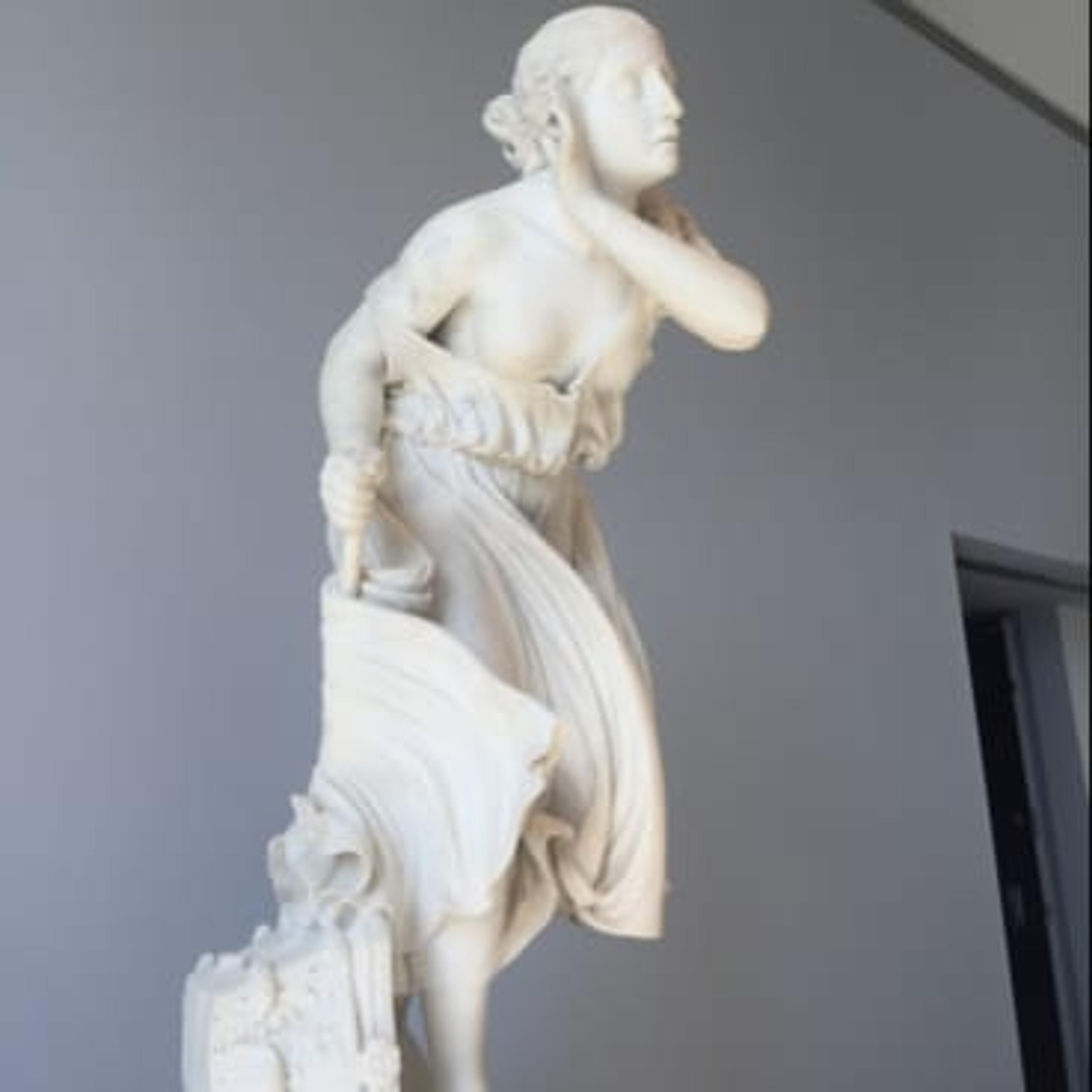 "Nydia" and "The Lost Pleiad" were both sculpted by the American artist Randolph Rogers. Rogers was very interested in history and mythology! The one at the left shows Nydia, a fictional character from the 1834 novel "The Last Days of Pompeii" by Lord Edward Bulwer-Lytton.