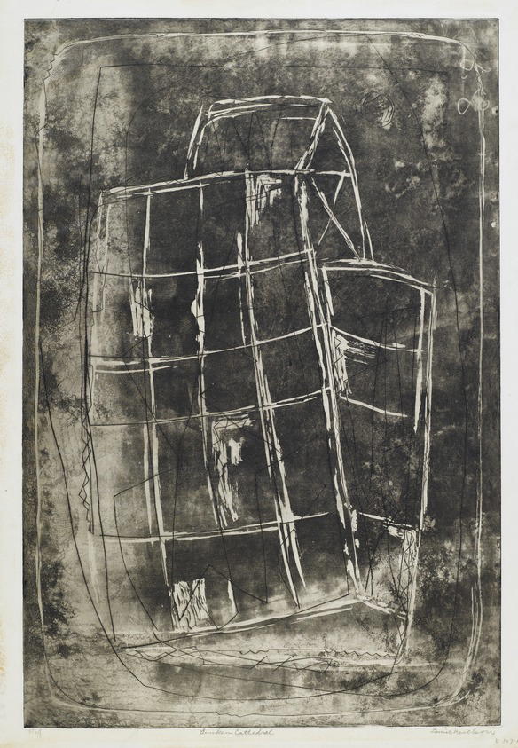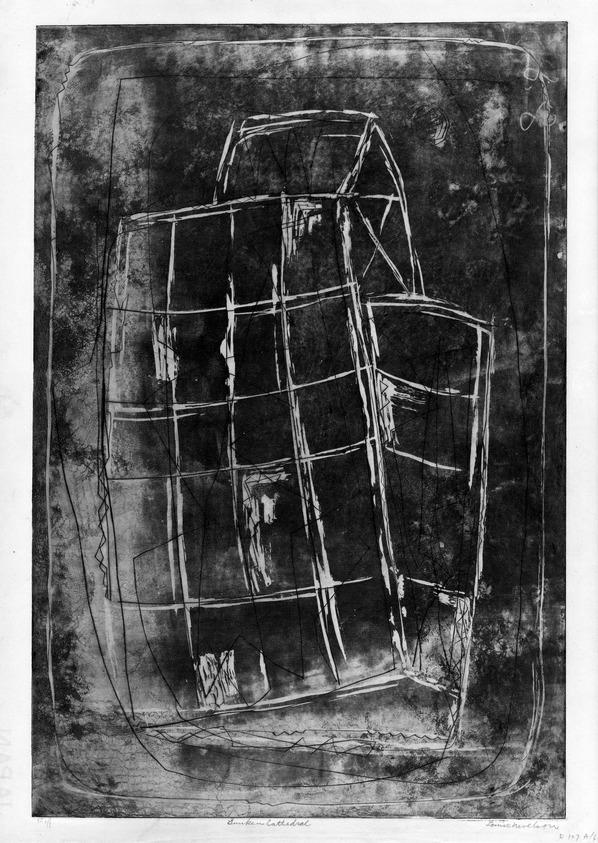 Louise Nevelson (American, born Ukraine, 1899–1988). Sunken Cathedral, 1952–1954. Etching and drypoint on paper, sheet: 22 1/4 x 17 3/8 in. (56.5 x 44.1 cm) image: 20 1/2 x 13 3/4 in. (52.1 x 34.9 cm). Brooklyn Museum, Gift of Louise Nevelson, 65.22.23. (Photo: Brooklyn Museum)