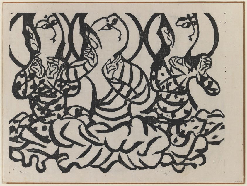 Munakata Shiko (Japanese, 1903–1975). Three Buddhas, 1940. Woodblock print on paper, sheet: 11 1/8 x 14 7/8 in. (28.3 x 37.8 cm). Brooklyn Museum, A. Augustus Healy Fund, 65.28.1. (Photo: Brooklyn Museum)