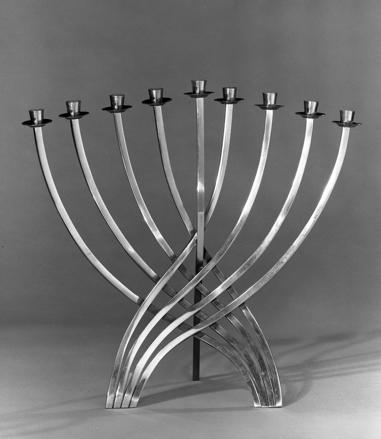 Ludwig Wolpert. Hanukah Menorah, Candle Holder, ca. 1962. Brass, 11 x 11 3/8 in. (27.9 x 28.9 cm). Brooklyn Museum, Gift of Dr. Abram Kanof, 65.198. (Photo: Brooklyn Museum)