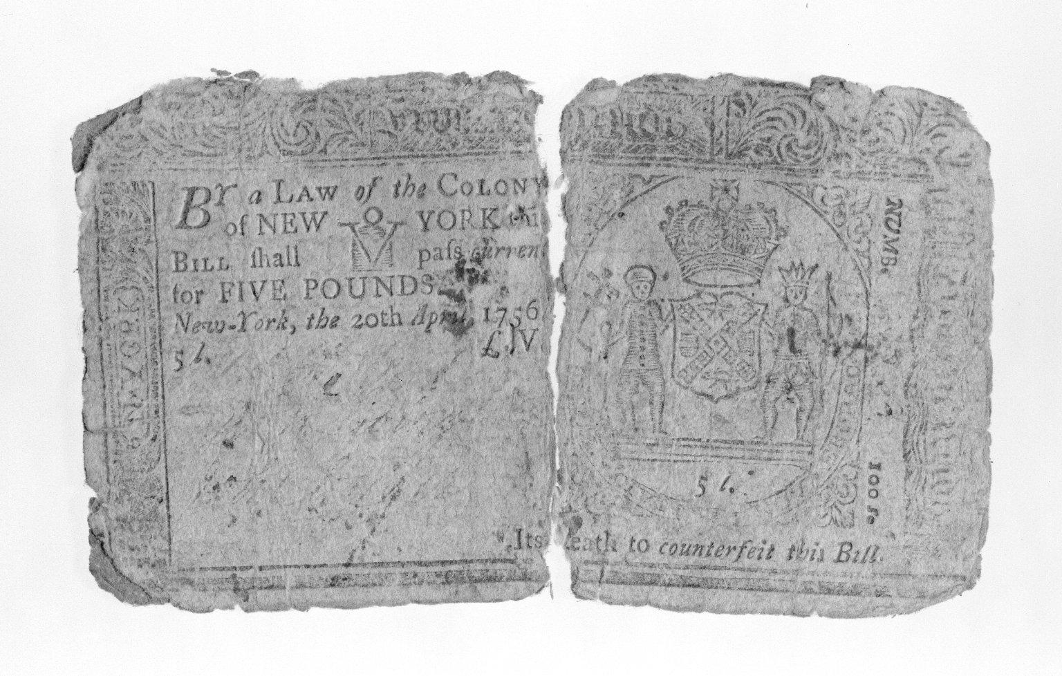 Ten Shilling Note Printed on Rag Paper, ca.1756. Rag Paper, 2 5/16 x 3 15/16 in. (5.9 x 10 cm). Brooklyn Museum, Gift of Reverend Cornelius Vander Naald, 68.6.7. (Photo: Brooklyn Museum)