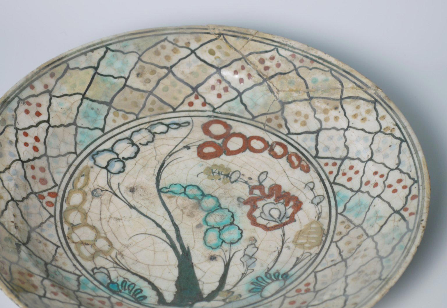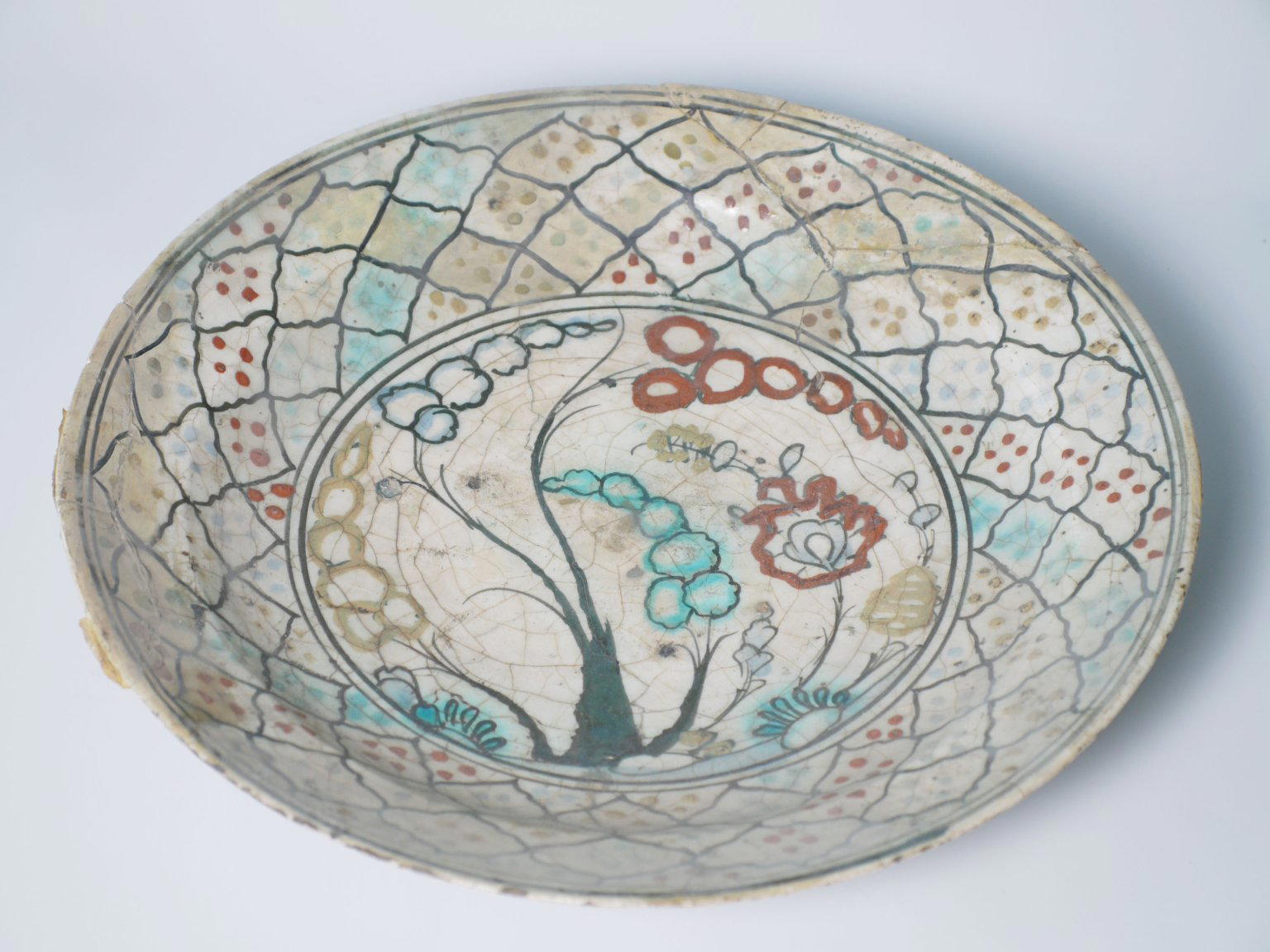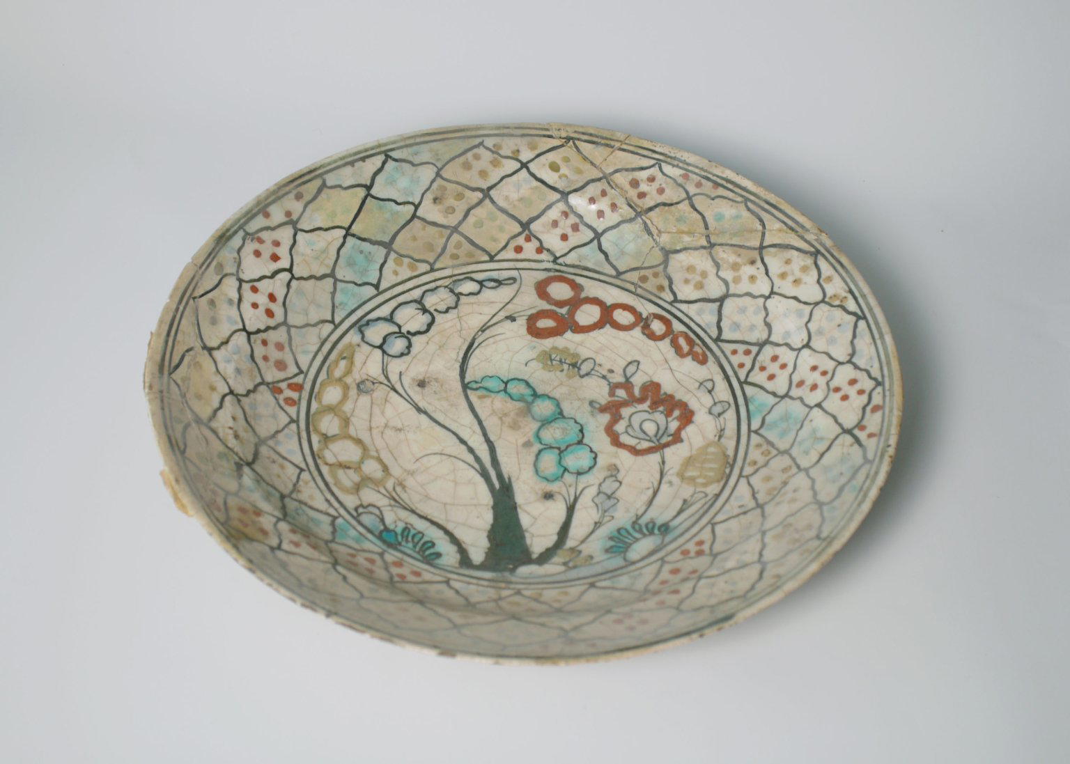 Ceramic, Kubachi ware; fritware, painted in black, blue and turquoise green with red and yellow slips under a transparent glaze