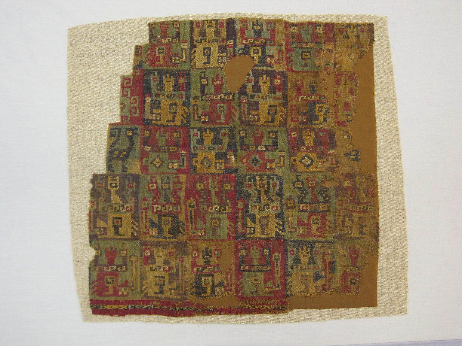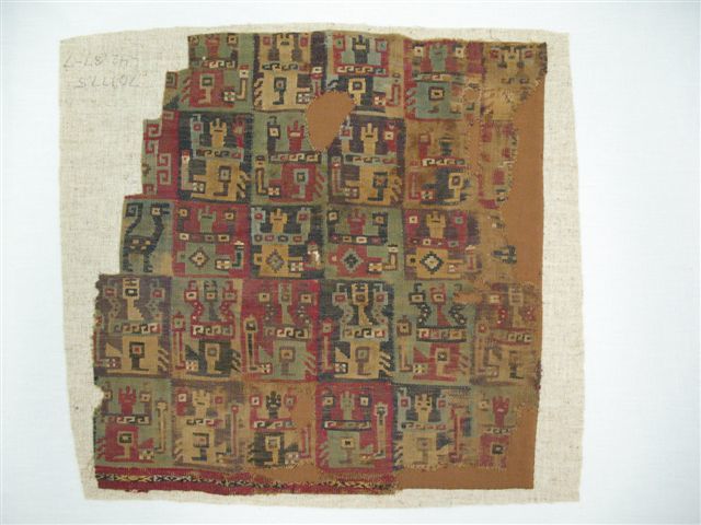 Coastal Wari (attributed by Nobuko Kajatani, 1993); Wari - derived (unnamed) (attrib by Anne Rowe, 1993); Middle Horizon (range attrib by AR and NK, 1993). Mantle, Fragment (NK) or Mantle?, Fragment or Carrying Cloth?, Fragment (AR), 600–1000. Cotton, camelid fiber, 14 3/4 x 14 15/16 in. (37.5 x 38 cm). Brooklyn Museum, Gift of Ernest Erickson, 70.177.5. (Photo: Brooklyn Museum)