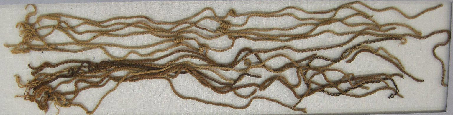 Inca (attrib by Nobuko Kajatani and Anne Rowe, 1993); Late Horizon (range attrib by NK and AR, 1993). Khipu Fragments, 1400–1532. Cotton, 16 3/4 × 3 11/16 × 1/8 in. (42.5 × 9.4 × 0.3 cm). Brooklyn Museum, Gift of Ernest Erickson, 70.177.71. (Photo: Brooklyn Museum)