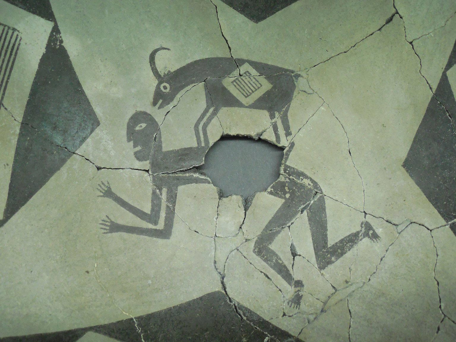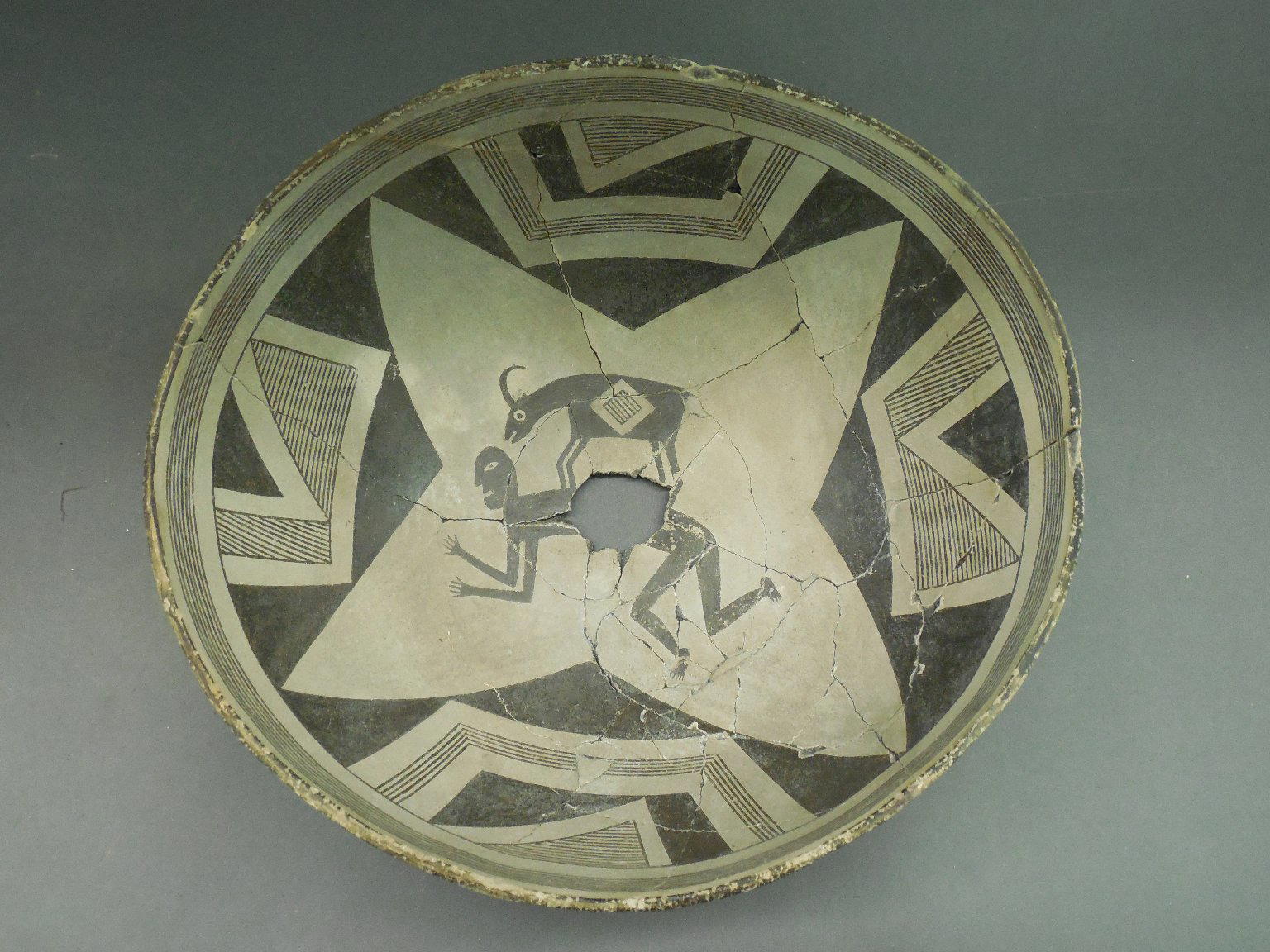 All that remains of Mimbres villages are rubble mounds with scattered pottery shards. No one knows if the Mimbres moved or who their descendants might be. Mimbres potters, probably women, created sophisticated designs for six hundred years. The pottery objects that have survived are primarily executed in black and white with complicated designs. Some of the best pottery pieces apparently had holes deliberately punched into their centers before they were placed in burials underneath house floors, but we do not know why.