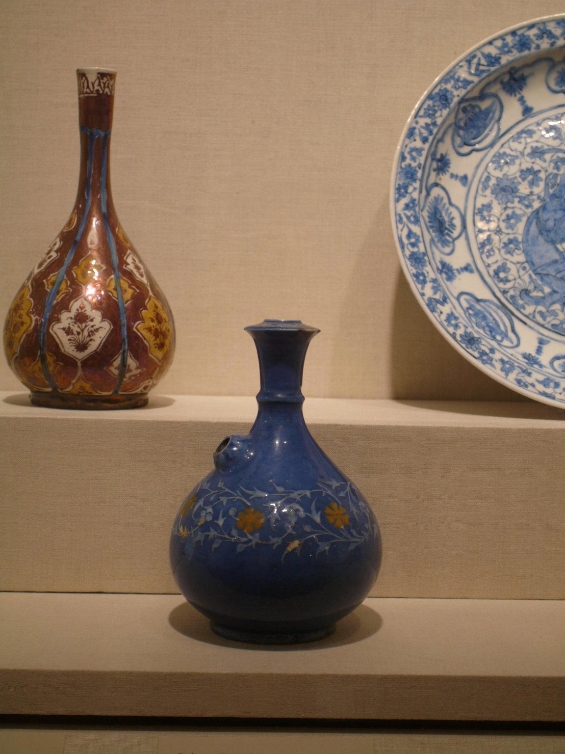 Qaliyan (Water Pipe), 17th century. Ceramic; fritware, painted in white slip under a cobalt blue glaze, overglaze painted in ochre, 10 x 6 1/4 in. (25.4 x 15.9 cm). Brooklyn Museum, Special Middle Eastern Art Fund, 73.66.1. (Photo: Brooklyn Museum)