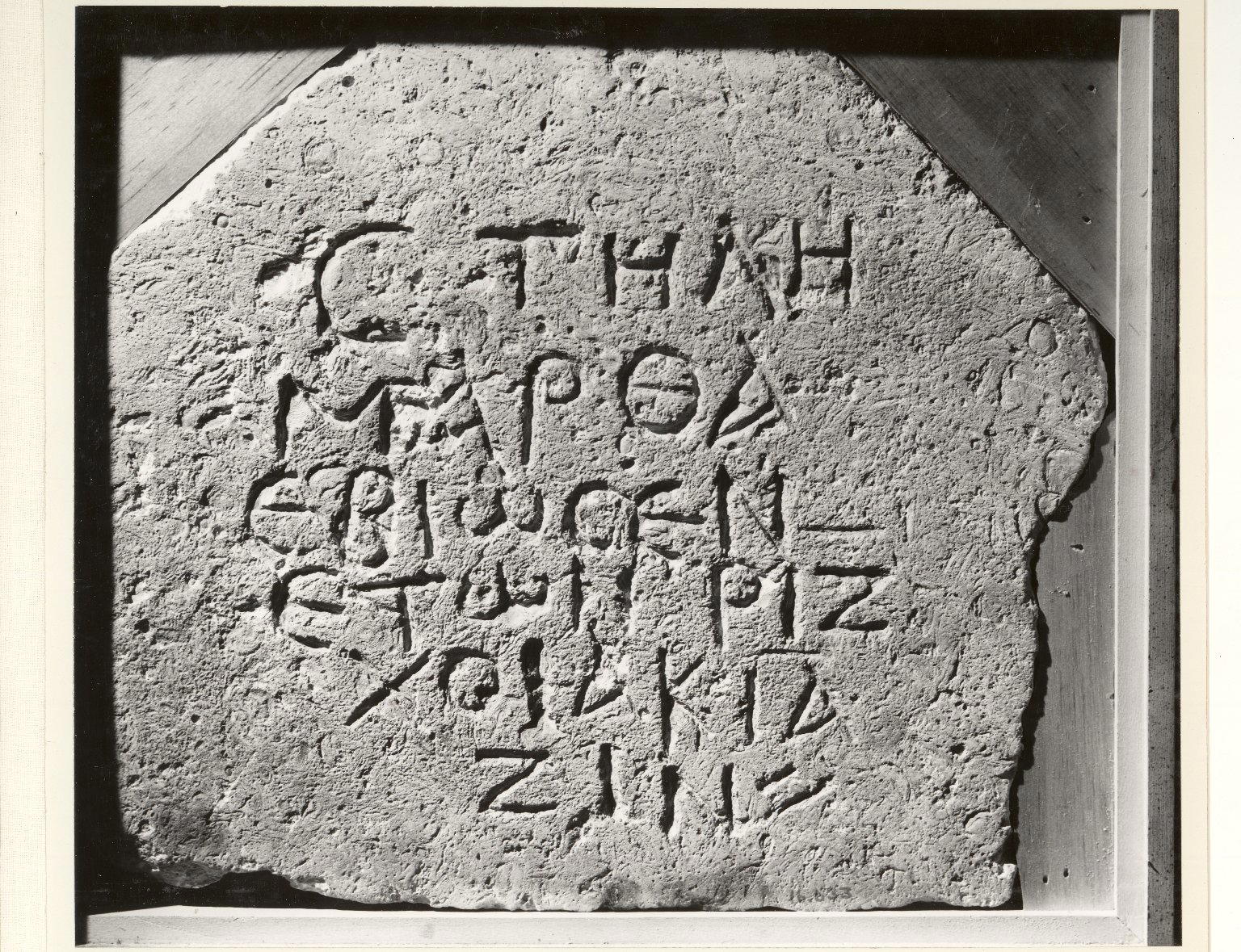 Greek. Slab (? Memorial Tablet), 402–417 C.E.. Limestone, 13 9/16 x 15 9/16 in. (34.5 x 39.5 cm). Brooklyn Museum, Gift of Evangeline Wilbour Blashfield, Theodora Wilbour, and Victor Wilbour honoring the wishes of their mother, Charlotte Beebe Wilbour, as a memorial to their father, Charles Edwin Wilbour, 16.633. (Photo: Brooklyn Museum)