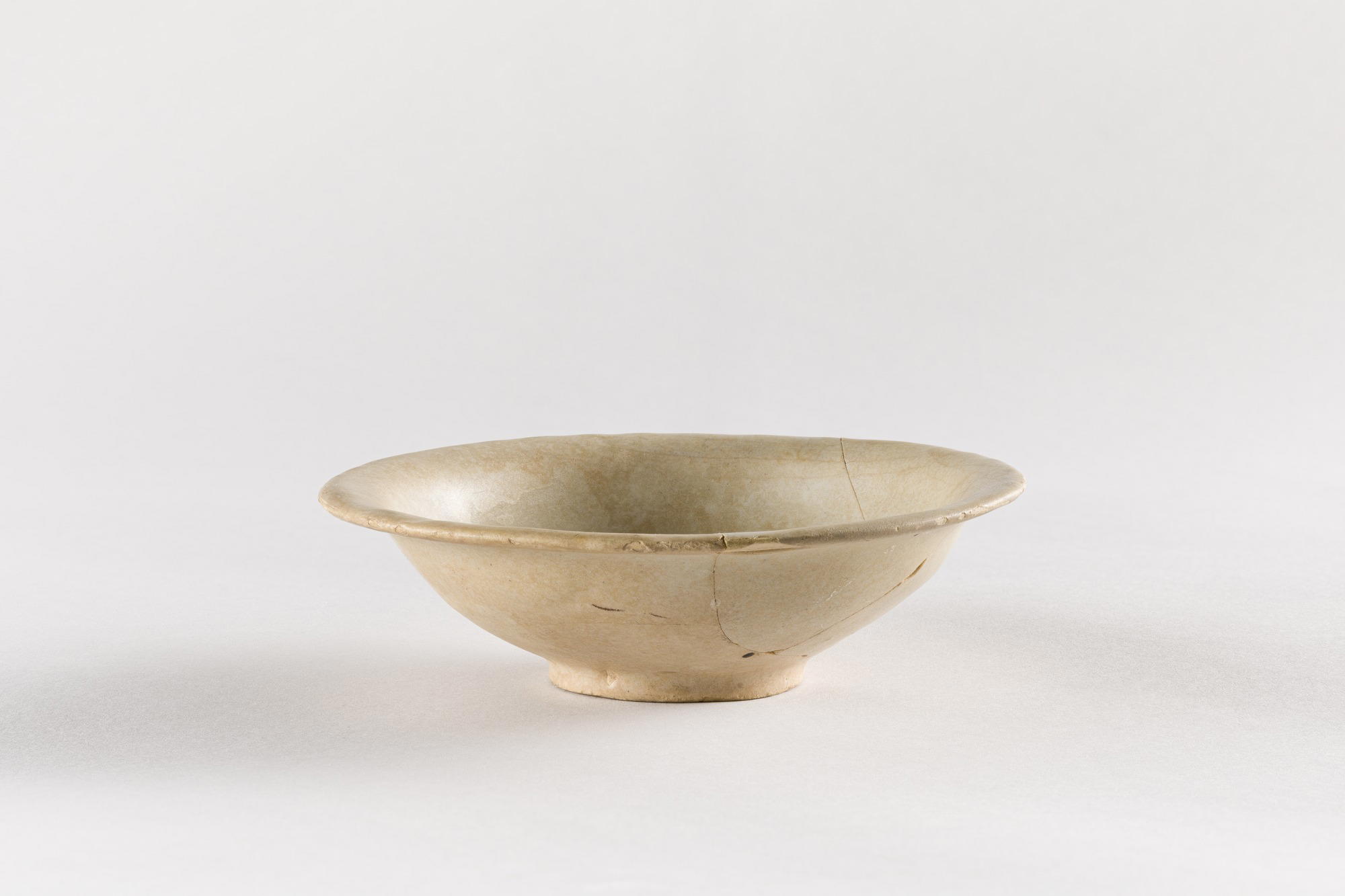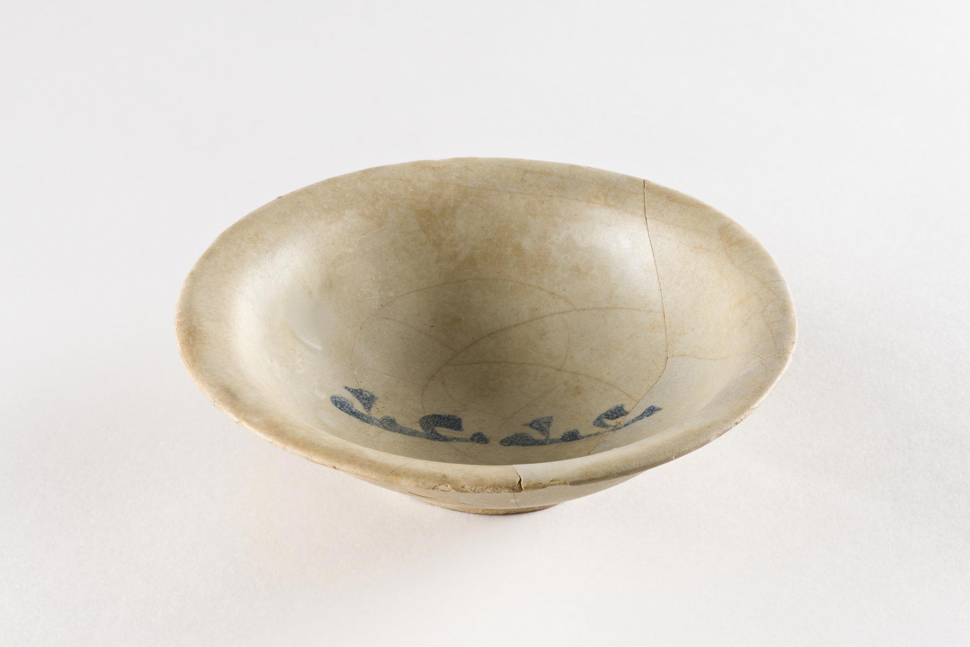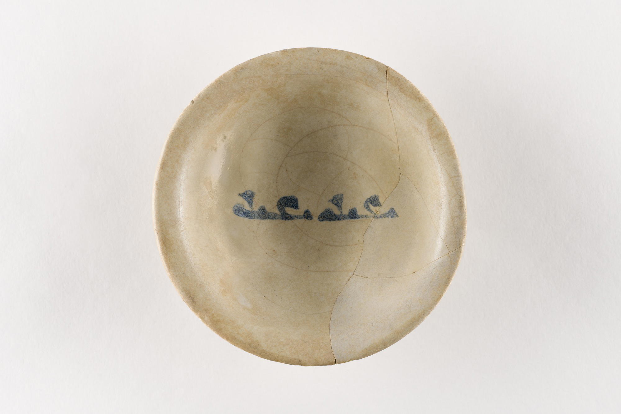 Blue and White Bowl with Kufic Inscription, 9th century. Ceramic; earthenware, painted in cobalt blue on an opaque white glaze., height: 1 5/16 in. (3.3 cm); diameter: 5 3/16 in. (13.2 cm). Brooklyn Museum, Gift of Ernest Erickson, 74.195. (Photo: Brooklyn Museum)