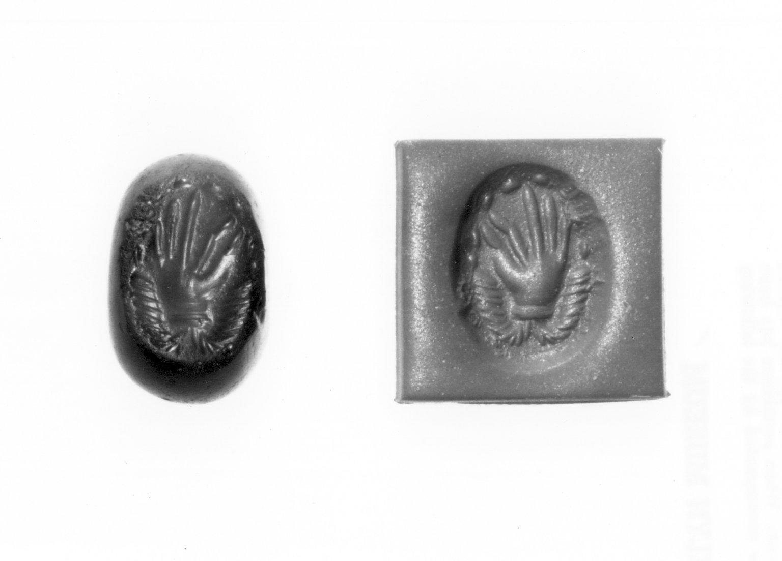 Ancient Near Eastern; Sasanian. Stamp Seal: Hand Surmounting Ribbons, 3rd–7th century C.E.. Jasper, Accession Cards: Measurements:. Brooklyn Museum, Designated Purchase Fund, 75.55.6. (Photo: Brooklyn Museum)