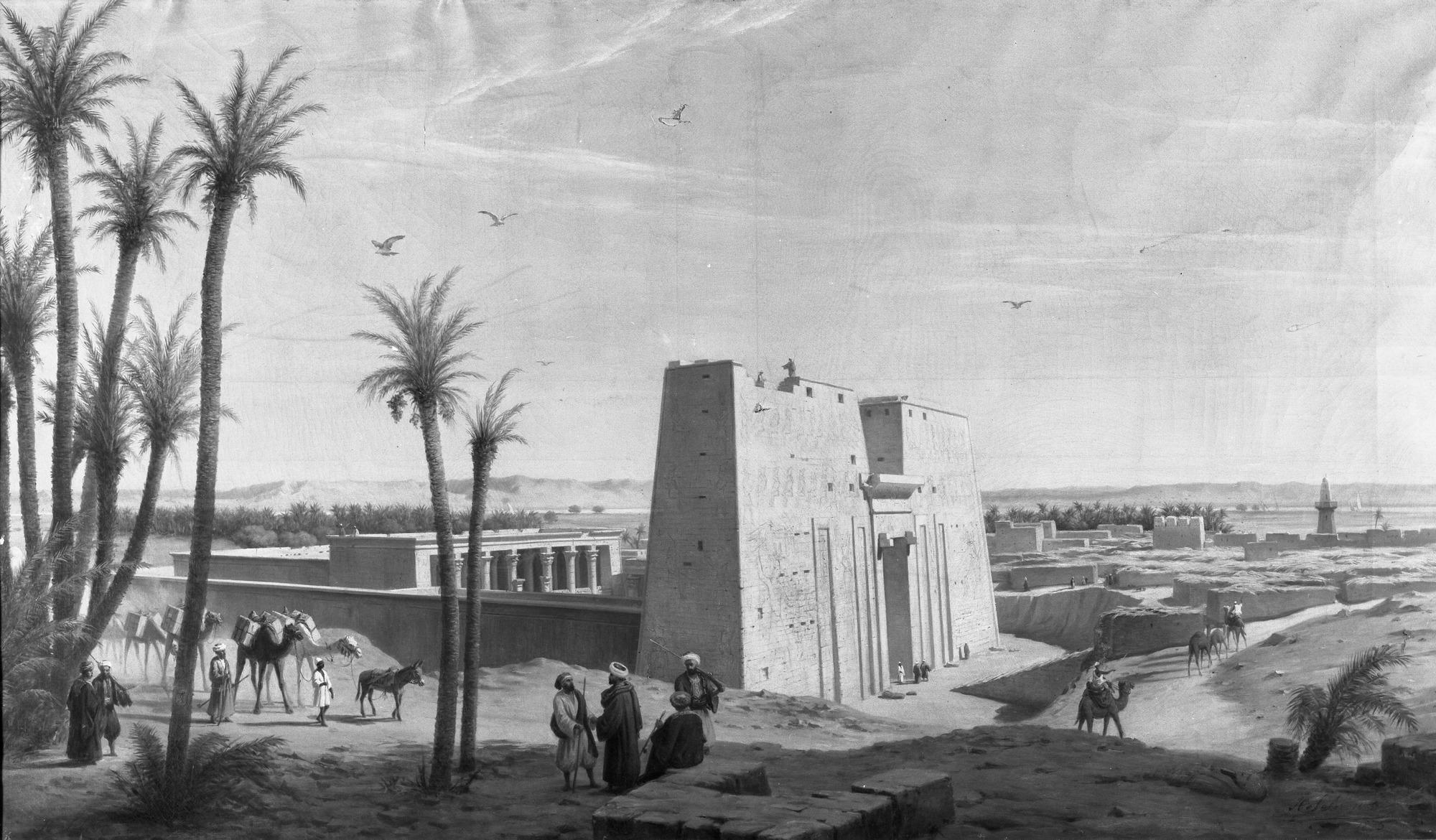 Hyppolyte Victor Valentin Sébron (French, 1801–1879). Temple of Edfou, 1876. Oil on canvas, 28 7/8 × 48 3/4 in. (73.3 × 123.8 cm) frame: 33 × 53 1/2 × 1 in. (83.8 × 135.9 × 2.5 cm). Brooklyn Museum, Gift of Evangeline Wilbour Blashfield, Theodora Wilbour, and Victor Wilbour honoring the wishes of their mother, Charlotte Beebe Wilbour, as a memorial to their father Charles Edwin Wilbour, 16.685. (Photo: Brooklyn Museum)
