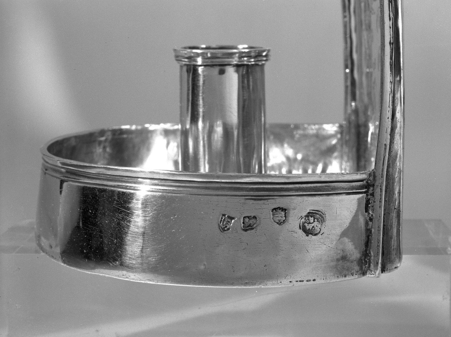 Dateletter "H" in black letter capitals within shield; leopard's head crowned: Lion passant and maker's mark "WG" crowned.