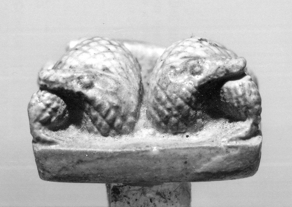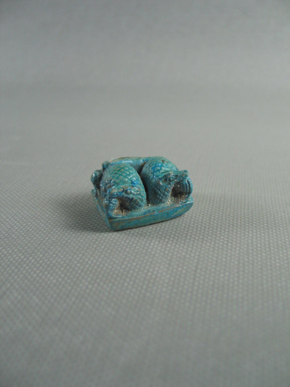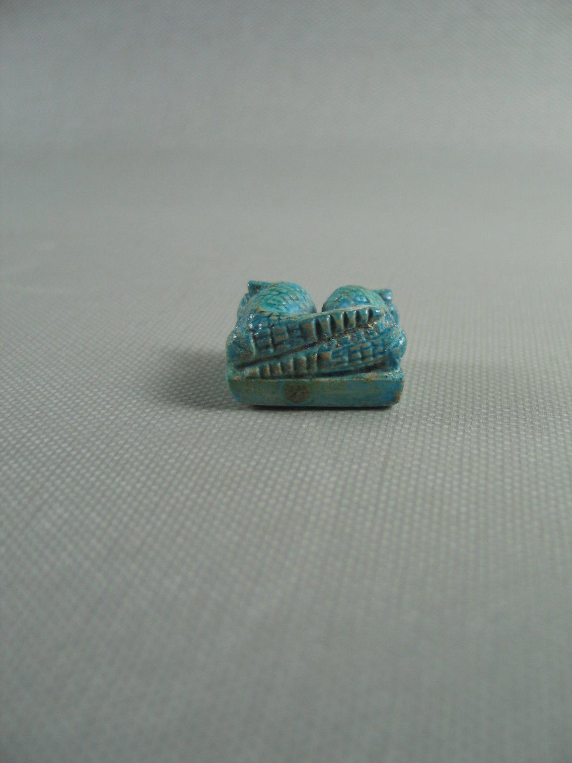 Double Crocodile Amulet, 664–343 B.C.E.. Faience, 9/16 x 11/16 x 7/8 in. (1.4 x 1.7 x 2.3 cm). Brooklyn Museum, Gift of Peter Sharrer, 76.37. (Photo: Brooklyn Museum)