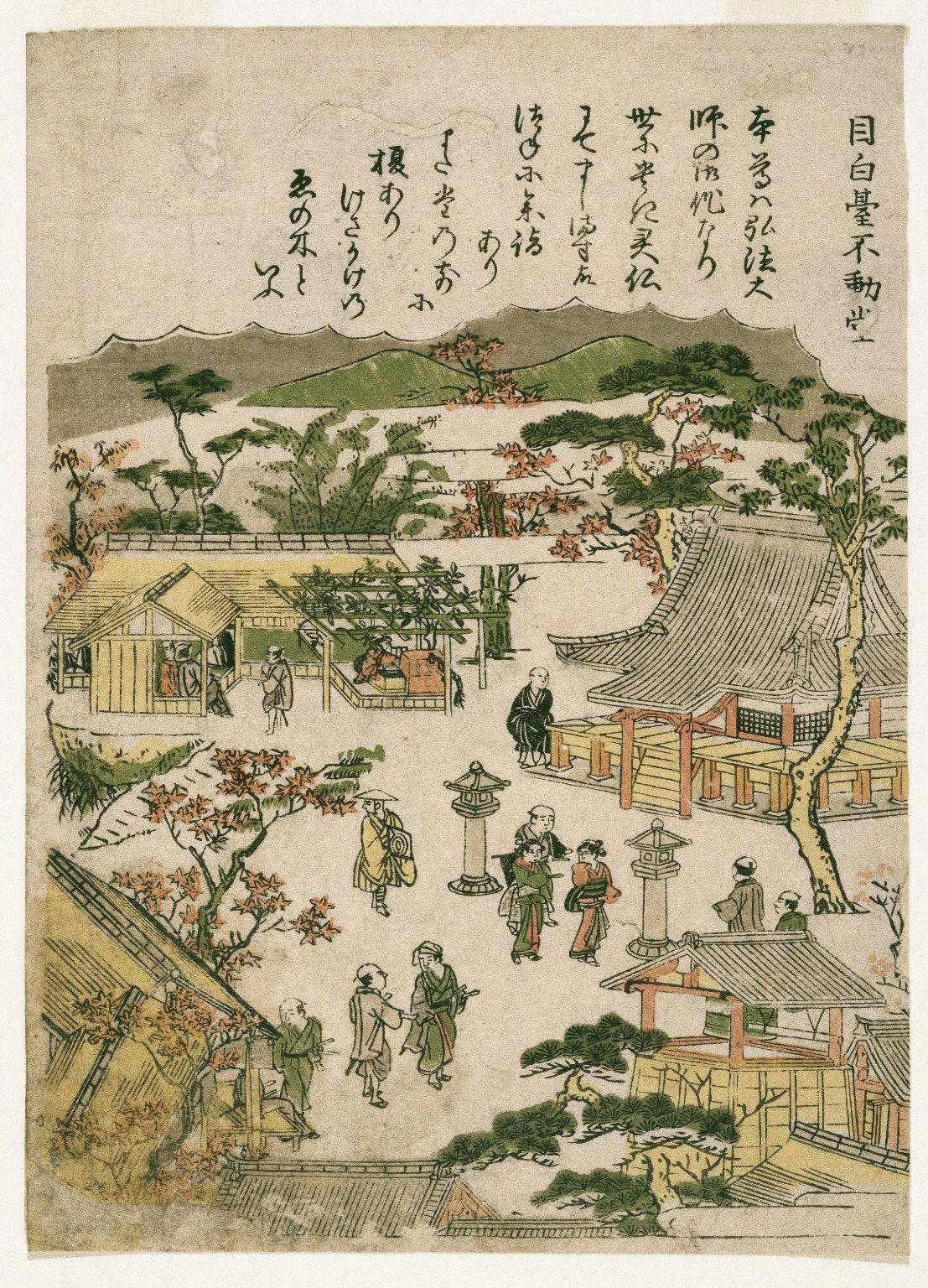 Kitao Shigemasa (Japanese, 1739–1820). Mejiro Fudo Shrine, from an untitled series of Famous Places in Edo, ca. 1770. Color woodblock print on paper, 8 1/2 x 6 1/8 in. (21.6 x 15.5 cm). Brooklyn Museum, Gift of Mr. and Mrs. Peter P. Pessutti, 76.183.20. (Photo: Brooklyn Museum)