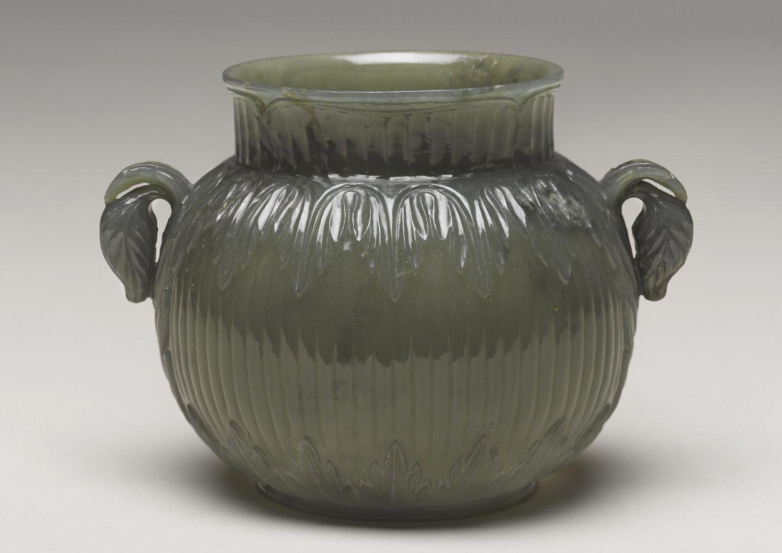 Gift exchange, tribute, the spread of religion, and overland as well as maritime trade were major transmitters of motifs, designs, and techniques between China and the Roman Empire, Iran, and India. Primary goods, such as medicinal herbs, spices, animals (especially horses), animal products, ores, and metals traveled east to China, while silk products, ceramics, metal wares, paper, printed texts, and mint coins traveled west.The Chinese Qianlong reign mark inscribed on the base of this carved jade cup produced in Mughal India testifies to the great distances some objects traveled over space and time and how they belonged to different owners at different times. The cup's shape may have derived from similar objects produced in Iran under the Timurids (1370–1507), while the acanthus motifs on its shoulders and handles recall India’s contact with Europe under the Mughals (1526–1858).