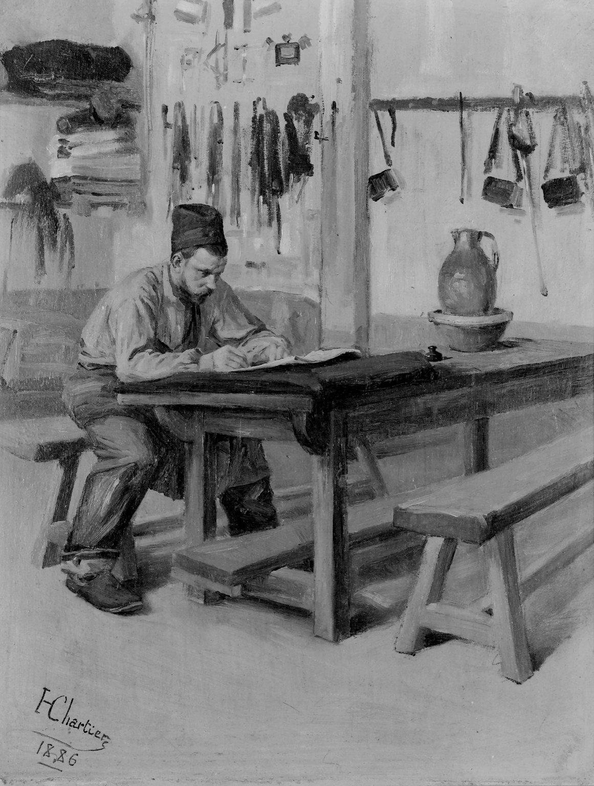 Henri-George-Jacques Chartier (French, 1859–1924). Military Life: Barracks Scene, 1886. Oil on board, 10 3/4 x 8 1/2 in. (27.3 x 21.6 cm). Brooklyn Museum, Gift of Burton Gordon, 79.288.1. (Photo: Brooklyn Museum)