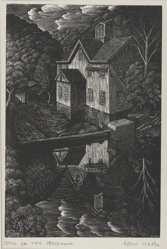 John DePol (American, 1913–2004). Mill on the Aspetuck, 1952. Wood engraving, Sheet: 8 5/8 x 6 9/16 in. (21.9 x 16.7 cm) Image: 6 3/8 x 3 15/16 in. (16.2 x 10 cm) Folder: 16 x 13 1/16 in. (40.6 x 33.2 cm). Brooklyn Museum, Designated Purchase Fund, 80.60.2. (Photo: Brooklyn Museum)