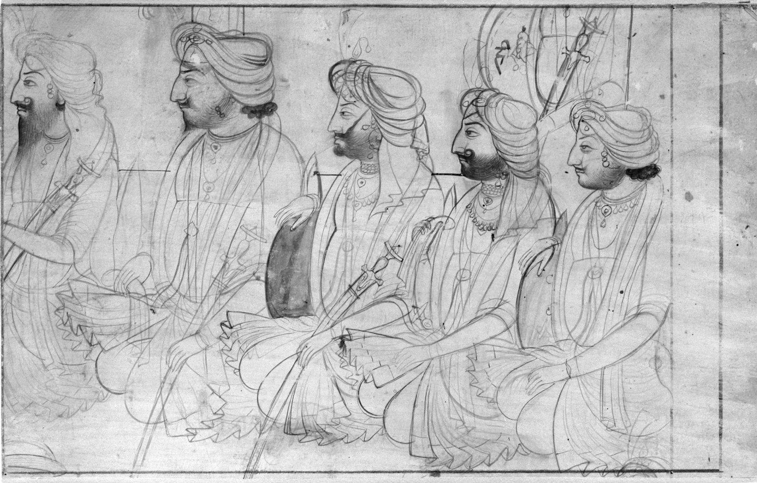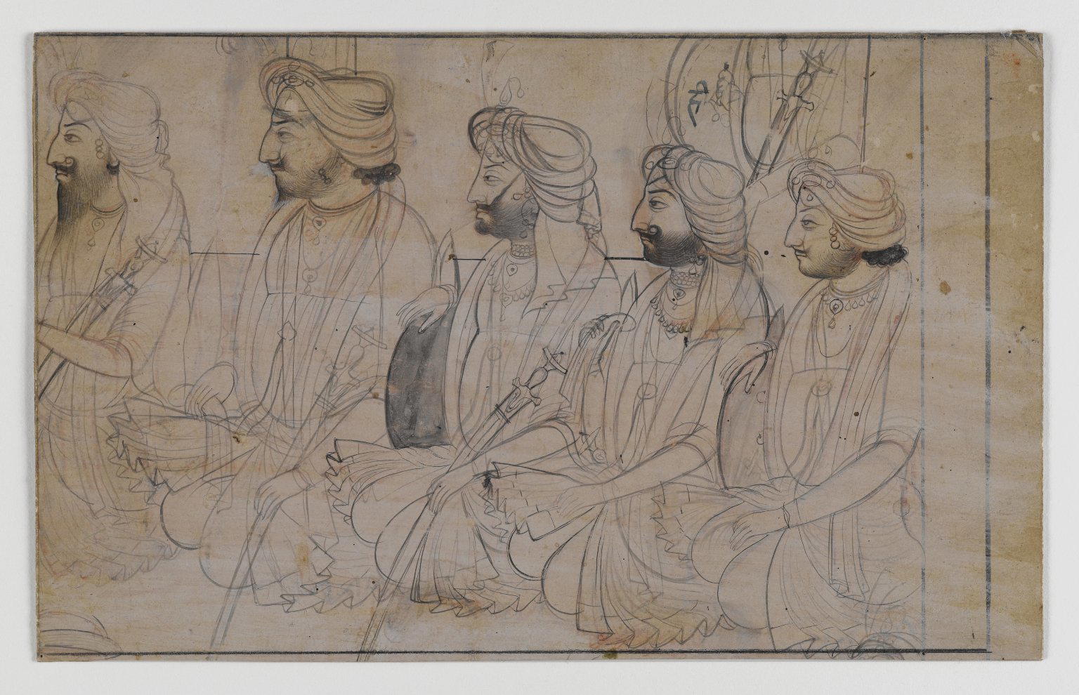 Indian. Portraits of Dhian, Gulab, Ranbir, Sohan, and Udham Singh, ca. 1820. Ink with white wash on paper, sheet: 4 1/2 x 7 1/4 in. (11.4 x 18.4 cm) image: 4 7/16 x 6 3/8 in. (11.3 x 16.2 cm). Brooklyn Museum, Gift of Marilyn W. Grounds, 80.261.41. (Photo: Brooklyn Museum)
