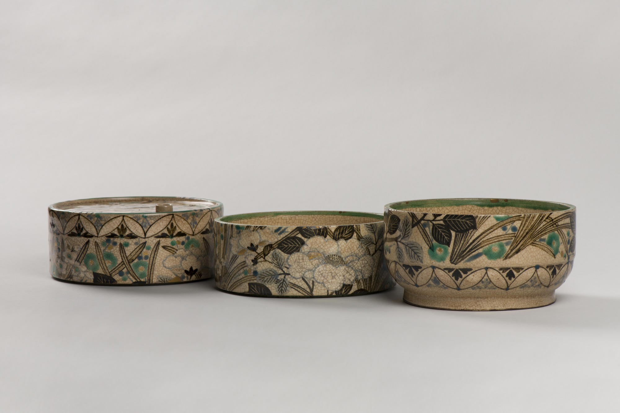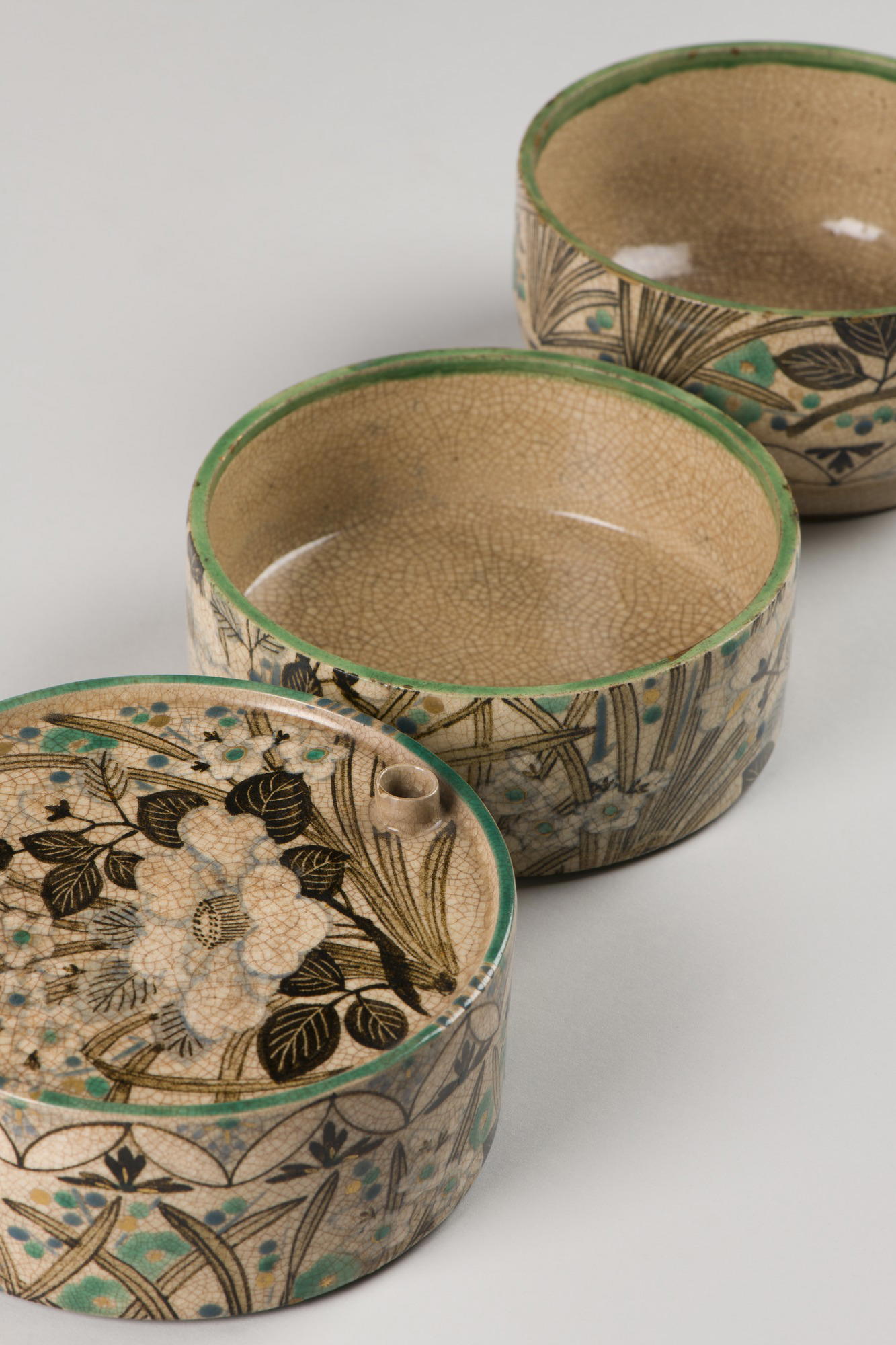 Awata Ware Jubako, Stacked Containers, late 18th–early 19th century. Painted pottery, 7 3/4 x 6 in. (19.7 x 15.2 cm) Lower section: 3 in. Middle section: 2 3/8 in. Upper section: 2 3/4 in. Brooklyn Museum, Designated Purchase Fund, 86.26a-c. (Photo: Brooklyn Museum)