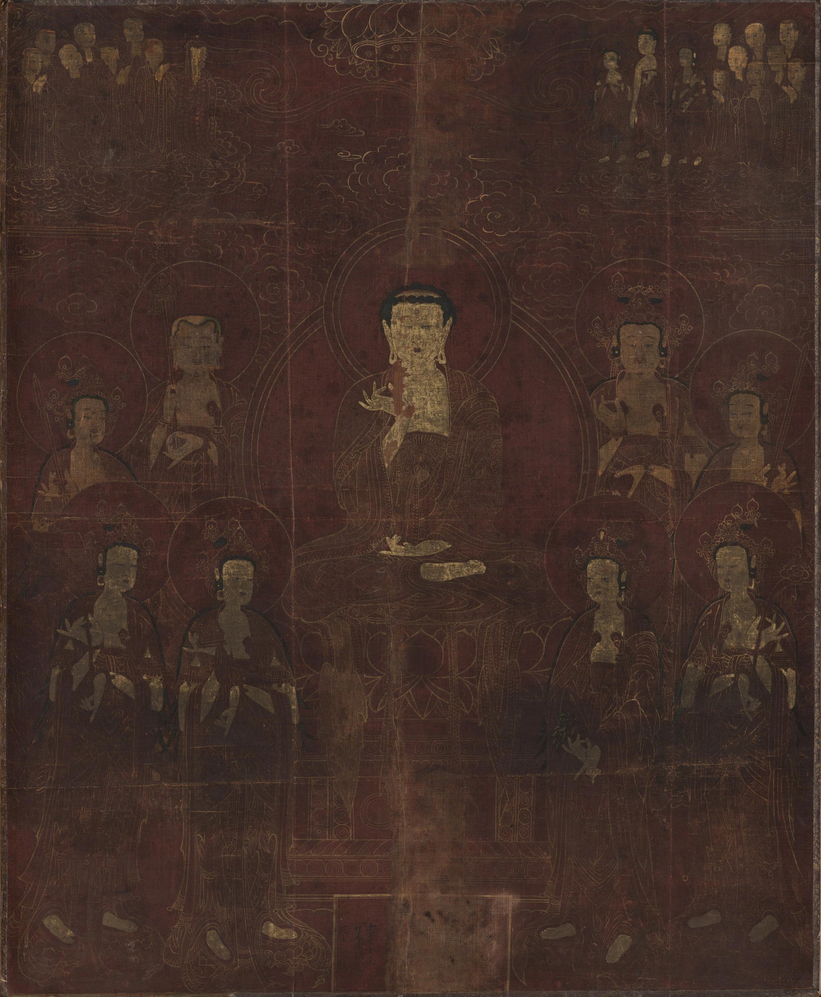 Although Buddhism had flourished in Korea for centuries, official patronage for Buddhist art virtually disappeared when the Joseon dynasty, which discouraged the practice of Buddhism in favor of Confucianism, took power in 1392. The faith never truly died out, however, and artists continued to make Buddhist imagery for less elite patrons. Amitabha, the Buddha of the Western Paradise, is shown here enthroned and making a teaching gesture. He is surrounded by an extensive retinue, including eight bodhisattvas, enlightened beings who assist mortals in their quest for enlightenment.